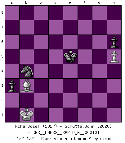 Last move : 1/2-1/2 2011 April 2 13:21:9 [Event "FICGS__CHESS__RAPID_A__000101"] [Site "FICGS"] [Date "2011.03.01"] [Round "1"] [White "Riha,Josef"] [Black "Schutte,John"] [Result "1/2-1/2"] [WhiteElo "2027"] [BlackElo "2020"] 1.e4 c5 2.Nf3 d6 3.d4 cxd4 4.Nxd4 Nf6 5.Nc3 a6 6.Be2 e5 7.Nb3 Be7 8.O-O O-O 9.Be3 Be6 10.f4 exf4 11.Rxf4 Nc6 12.Nd5 Rc8 13.Bb6 Qd7 14.c4 Ne5 15.Nd2 Bxd5 16.cxd5 Qe8 17.Be3 Nfd7 18.Rf5 Bf6 19.Qb3 Rc7 20.Raf1 Qe7 21.a4 g6 22.R5f2 Bg5 23.a5 Rfc8 24.g3 Rc2 25.Bxg5 Qxg5 26.Nf3 Nxf3+ 27.Qxf3 Ne5 28.Qb3 Qe7 29.Bg4 Rxf2 30.Bxc8 Rxf1+ 31.Kxf1 Qd8 32.Qc3 Qe8 33.Kf2 Qb5 34.Bh3 Qa4 35.Bg2 Qa1 36.Bf1 Qb1 37.Be2 Kg7 38.Bf3 Qd3 39.Qxd3 Nxd3+ 40.Ke3 Nxb2 41.Kd4 Kf8 42.e5 Ke7 43.Be2 Na4 44.Bc4 Nc5 45.g4 Nd7 46.exd6+ Kxd6 47.h3 Nc5 48.h4 f6 49.h5 gxh5 50.gxh5 h6 51.Ke3 Ke5 52.d6 f5 53.Kf3 Nd7 54.Bf1 Nf6 55.Be2 f4 56.Bd1 Kxd6 57.Kxf4 Nd5+ 58.Kg3 Ke5 59.Bf3 b5 60.axb6 Nxb6 61.Kf2 a5 62.Ke3 a4 63.Bd1 a3 64.Bb3 Nd5+ 65.Kd2 Kd4 66.Kc2 Nb4+ 67.Kb1 Ke5 1/2-1/2 Sicilian : Najdorf, Opovcensky variation Kingside Castling by player White (move 8) Kingside Castling by player Black (move 8) 10 pieces endgame at move 56 : White KBPP , Black KNPPPP WHITE : King + 1 Bishop 2 Pawns BLACK : King + 1 Knight 4 Pawns 9 pieces endgame at move 57 : White KBPP , Black KNPPP WHITE : King + 1 Bishop 2 Pawns BLACK : King + 1 Knight 3 Pawns 8 pieces endgame at move 60 : White KBPP , Black KNPP WHITE : King + 1 Bishop 2 Pawns BLACK : King + 1 Knight 2 Pawns 7 pieces endgame at move 60 : White KBP , Black KNPP WHITE : King + 1 Bishop 1 Pawn BLACK : King + 1 Knight 2 Pawns This chess game ended in a draw. Follow this game move after move (download)It began to feel as though you were playing against Chess itself. - On playing against Robert Fischer. (Walter Shipman) Ich habe die Schachforschung dermaßen betrieben, dass sie auf eine wissenschaftliche Basis gestellt wurde. (Mikhail Moiseyevich Botvinik) Solo el jugador con la iniciativa tiene el derecho a atacar. (Wilhelm Steinitz) Le système Elo représente seulement une moyenne. Il est simplement un indicateur de votre stabilité. (Anatoli Karpov) Either move or be moved. (Ezra Pound)
