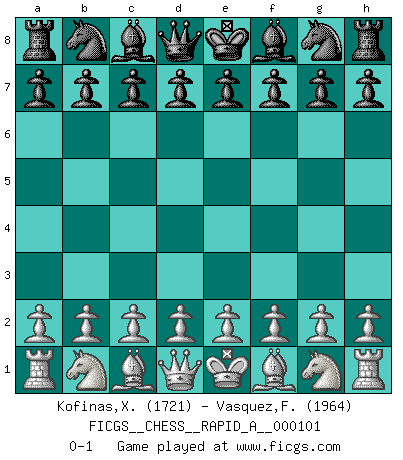 Last move : 0-1 2011 April 18 3:59:43 [Event "FICGS__CHESS__RAPID_A__000101"] [Site "FICGS"] [Date "2011.03.17"] [Round "1"] [White "Kofinas,Xristos"] [Black "Vasquez,Fernando"] [Result "0-1"] [WhiteElo "1721"] [BlackElo "1964"] 0-1 This chess game has been lost on time (started : 2011.03.17 11:29:46) Player Black won this chess game. Follow this game move after move (download)Chess, like love, is infectious at any age. (Flohr) Frage: Gibt es etwas was Sie mehr lieben als Autobahnen ohne Tempobegrenzungen? - Antwort: Deutsche Frauen ohne Tempobegrenzungen. (Loek van Wely) Uno por uno, yo los acribillé, mi superioridad muy pronto se volvio aparente. (Jose Capablanca) C'est la seule position que je connaisse où les deux camps sont mals. Propos prêtés à V. Anand. The obstacle is the path. (Zen proverb)