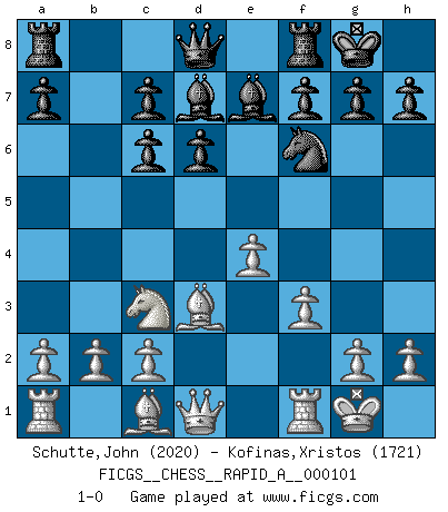 Last move : 1-0 2011 April 14 15:30:25 [Event "FICGS__CHESS__RAPID_A__000101"] [Site "FICGS"] [Date "2011.03.01"] [Round "1"] [White "Schutte,John"] [Black "Kofinas,Xristos"] [Result "1-0"] [WhiteElo "2020"] [BlackElo "1721"] 1.e4 e5 2.Nf3 Nc6 3.Bb5 d6 4.d4 exd4 5.Nxd4 Bd7 6.O-O Nf6 7.Nc3 Be7 8.f3 O-O 9.Nxc6 bxc6 10.Bd3 1-0 This chess game has been lost on time (started : 2011.03.01 23:42:47) Ruy Lopez : Old Steinitz defense Kingside Castling by player White (move 6) Kingside Castling by player Black (move 8) Player White won this chess game. Follow this game move after move (download)In Chess, at least, the brave inherit the earth. (Edmar Mednis) Ein Kibitz ist einer, der deinem Gegner gute Ratschläge gibt. (Andrew Soltis) Nunca nadie ha ganado una partida de Ajedrez rindiendose. (Unknown) Les Echecs ne sont pas pour les âmes timides. Ils requièrent un homme entier, qui ne s'arrête pas aveuglément à ce qui a été déjà établi, mais qui tente individuellement de sonder les profondeurs du jeu. (W. Steinitz) How many people work in NATO Headquarters ? - About half of them. (Dirk Stikker, NATO general secretary)