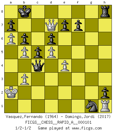 Last move : 1/2-1/2 2011 July 16 18:25:58 [Event "FICGS__CHESS__RAPID_A__000101"] [Site "FICGS"] [Date "2011.03.17"] [Round "1"] [White "Vasquez,Fernando"] [Black "Domingo,Jordi"] [Result "1/2-1/2"] [WhiteElo "1964"] [BlackElo "2017"] 1.e4 c5 2.d4 h6 3.d5 d6 4.Nf3 g5 5.h3 Bg7 6.Be2 Nd7 7.O-O Nf8 8.a4 Ng6 9.a5 Nf6 10.Nc3 Bd7 11.a6 b6 12.Re1 g4 13.hxg4 Nxg4 14.Nb5 h5 15.c3 N4e5 16.Nh2 Qc8 17.Nf1 Bf6 18.f4 Ng4 19.Ra4 Rg8 20.Qb3 Nh4 21.g3 Rg7 22.f5 Ne5 23.Rd1 Nhf3+ 24.Kg2 Ng5 25.Bf4 h4 26.Nd2 Kf8 27.Rh1 h3+ 28.Kf1 Rh7 29.c4 Qd8 30.Ra3 Bxb5 31.cxb5 Ke8 32.Qe3 Rg7 33.Ke1 Kd7 34.Qf2 Qh8 35.g4 Rh7 36.Kd1 Qg7 37.Kc2 Rah8 38.Kb1 h2 39.Qf1 Kc8 40.Rb3 Nd7 41.Ka1 Be5 42.Ka2 Kb8 43.Nc4 Bxf4 44.Qxf4 Ne5 45.Rc3 Nh3 46.Qg3 Ng1 47.Bf1 Nxg4 48.Qg2 Qg5 49.f6 Rh4 50.Rg3 Qxf6 51.Rxg4 Rxg4 52.Qxg4 Qxf1 53.Qd7 Qxc4+ 54.b3 1/2-1/2 Sicilian : Smith-Morra gambit Kingside Castling by player White (move 7) This chess game ended in a draw. Follow this game move after move (download)When you absolutely don't know what to do anymore, it is time to panic. (John van der Wiel) Du musst Deinen Gegner in einen tiefen dunklen Wald führen wo 2+2=5 ist und wo der Weg, der wieder hinausführt, nur breit genug für einen ist. (Mikhail Nekhemyevich Tal) El Ajedrez es como la guerra en un tablero. (Bobby Fischer) Mais l'homme est une créature légère et illogique : semblable au joueur d'échecs, il n'aime que le processus du but à atteindre, non le but lui-même. (Dostoïevsky) It is not true that people stop pursuing dreams because they grow old, they grow old because they stop pursuing dreams. (Gabriel Garcia Marquez)