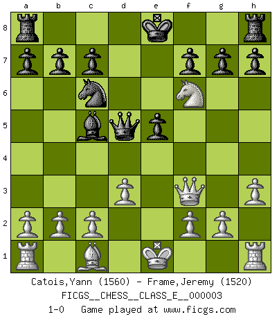Last move : 1-0 2006 May 30 18:6:10 [Event "FICGS__CHESS__CLASS_E__000003"] [Site "FICGS"] [Date "2006.05.02"] [Round "1"] [White "Catois,Yann"] [Black "Frame,Jeremy"] [Result "1-0"] [WhiteElo "1560"] [BlackElo "1520"] 1.e4 e5 2.Nf3 Nf6 3.Nc3 Nc6 4.Bc4 Nxe4 5.Nxe4 d5 6.Bxd5 Qxd5 7.d3 Bg4 8.h3 Bxf3 9.Qxf3 Bc5 10.Nf6+ 1-0 Petrov Three knights game Player White won this chess game. Follow this game move after move (download)I thought the most common mistake [in chess] was the first one: Learning the game :P (Garvin Gray, FICGS forum) Das Zentrum ist der Balkan des Schachbretts - Kriegshandlungen können in jedem Moment ausbrechen. (Aaron Nimzowitsch) La vida es como el Ajedrez, con lucha, competición y eventos buenos y malos. (Benjamin Franklin) Nous sommes les pions de la mystérieuse partie d'Echecs jouée par Dieu. Il nous déplace, nous arrête, nous pousse encore, puis nous lance un à un dans la boîte du Néant. Epitaphe sur la tombe de David Janowsky (1868-1927). Computer Science is no more about computers than astronomy is about telescopes. (Edsger W. Dijkstra)