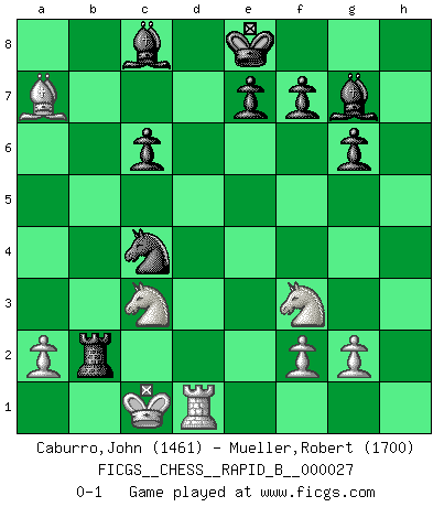 Last move : 0-1 2007 January 6 17:2:25 [Event "FICGS__CHESS__RAPID_B__000027"] [Site "FICGS"] [Date "2006.12.12"] [Round "1"] [White "Caburro,John"] [Black "Mueller,Robert"] [Result "0-1"] [WhiteElo "1461"] [BlackElo "1700"] 1.d4 Nf6 2.c4 g6 3.Nc3 d5 4.h4 Bg7 5.cxd5 Nxd5 6.h5 c5 7.hxg6 hxg6 8.Rxh8+ Bxh8 9.e3 Nc6 10.Bc4 Nb6 11.Bb5 cxd4 12.Bxc6+ bxc6 13.exd4 Qxd4 14.Qxd4 Bxd4 15.Nf3 Bg7 16.Be3 Nc4 17.O-O-O Rb8 18.Bxa7 Rxb2 0-1 King's Indian defense, 3.Nc3 Queenside Castling by player White (move 17) Player Black won this chess game. Follow this game move after move (download)Excellence at Chess is one mark of a scheming mind. (Sir Arthur Conan Doyle) Im Internet Chess Club betrug mein Rating vorübergehend 3350 ELO-Punkte. (Sergej Karjakin) De eso se trata el Ajedrez. Un día le das una lección a tu oponente y al día siguiente el te da una a tí. (Bobby Fischer) La vie est comme un jeu d'échecs : nous esquissons un plan, mais celui-ci est tributaire de ce que daignent faire l'adversaire aux échecs et le destin dans la vie. (Arthur Schopenhauer) Kids, you tried your best and you failed miserably. The lesson is, never try. (Simpsons)