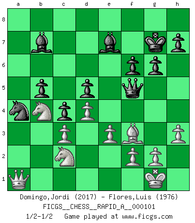 Last move : 1/2-1/2 2011 May 14 0:29:46 [Event "FICGS__CHESS__RAPID_A__000101"] [Site "FICGS"] [Date "2011.03.01"] [Round "1"] [White "Domingo,Jordi"] [Black "Flores,Luis"] [Result "1/2-1/2"] [WhiteElo "2017"] [BlackElo "1976"] 1.b4 e5 2.Bb2 d5 3.a3 a5 4.Bxe5 Nc6 5.Bb2 axb4 6.Nf3 Nf6 7.e3 Be7 8.axb4 Rxa1 9.Bxa1 Nxb4 10.Bxf6 Bxf6 11.c3 Na6 12.d4 O-O 13.Bd3 c5 14.Qc2 g6 15.Qb2 c4 16.Bc2 Nc7 17.O-O b5 18.Na3 Qd7 19.Rb1 Ba6 20.Bd1 Ra8 21.Nc2 Be7 22.Ra1 f6 23.Nb4 Bb7 24.Rxa8+ Nxa8 25.Ne1 Nb6 26.Nec2 Kg7 27.Bf3 Na4 28.Qa1 Qf5 29.h3 1/2-1/2 Polish (Sokolsky) opening Kingside Castling by player Black (move 12) Kingside Castling by player White (move 17) This chess game ended in a draw. Follow this game move after move (download)Before the endgame, the Gods have placed the middle game. (Siegbert Tarrasch) Die Jungen erwarten, dass Opa einfach umfällt. Dann aber kann Opa fünf Stunden lang Schach spielen und die jungen Gegner an die Wand drücken. (Viktor Kortschnoi) Yo adoro todas la posiciones. Denme una partida posicional difícil, y la jugaré. Pero posiciones totalmente ganadas, no las tolero. (Hein Donner) Le jeu d'échecs est comme rejeté hors du temps. (Antoine de Saint-Exupéry) Dave, my mind is going. I can feel it. (HAL 9000 in 2001, a space odyssey)