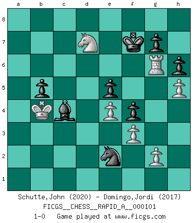 Last move : 1-0 2011 June 23 18:48:29 [Event "FICGS__CHESS__RAPID_A__000101"] [Site "FICGS"] [Date "2011.03.01"] [Round "1"] [White "Schutte,John"] [Black "Domingo,Jordi"] [Result "1-0"] [WhiteElo "2020"] [BlackElo "2017"] 1.e4 c5 2.Nf3 h6 3.d4 cxd4 4.Nxd4 Nf6 5.Nc3 e5 6.Nf5 Nc6 7.Nd6+ Bxd6 8.Qxd6 Qe7 9.Qxe7+ Kxe7 10.Be3 d6 11.f3 Be6 12.O-O-O Rhd8 13.h4 Nh5 14.Bf2 Rac8 15.Rg1 a6 16.b3 Kf8 17.Bb6 Rd7 18.Na4 Ne7 19.c4 Rc6 20.Kb2 Ng3 21.Bd3 f5 22.Bf2 f4 23.b4 Rd8 24.c5 Kf7 25.b5 Rc7 26.cxd6 Rxd6 27.Bc5 R6d7 28.Ba7 axb5 29.Nc5 Rxd3 30.Rxd3 Bc4 31.Rd7 Rxd7 32.Nxd7 Nc6 33.Bf2 Ne2 34.Rd1 Bxa2 35.Nc5 Be6 36.Nxb7 Kf6 37.Rd6 Ned4 38.Bxd4 Nxd4 39.Rb6 Ke7 40.Nc5 Bc4 41.Rg6 Kf7 42.h5 Be6 43.Kc3 Ne2+ 44.Kb4 Bc4 45.Nd7 1-0 Sicilian defense Queenside Castling by player White (move 12) Player White won this chess game. Follow this game move after move (download)Combinations have always been the most intriguing aspect of Chess. The masters look for them, the public applauds them, the critics praise them. It is because combinations are possible that Chess is more than a lifeless mathematical exercise. They are the poetry of the game; they are to Chess what melody is to music. They represent the triumph of mind over matter. (Reuben Fine) Dein Körper muss in Topform sein. Dein Schach verfällt, wenn dein Körper verfällt. Der Körper kann nicht vom Geist getrennt werden. (Robert James Fischer) La única cosa que los jugadores de Ajedrez tienen en común, es el Ajedrez. (Lodewijk Prins) Mais n'est-ce pas déjà le limiter injurieusement que d'appeler les échecs un jeu? N'est-ce pas aussi une science, un art, ou quelque chose qui, comme le cercueil de Mahomet entre ciel et terre, est suspendu entre l'un et l'autre, et qui réunit un nombre incroyable de contraires ? (Stefan Zweig) Don't be irreplaceable, if you can't be replaced, you can't be promoted. (Dan Rotaru)