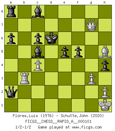 Last move : 1/2-1/2 2011 April 27 11:40:12 [Event "FICGS__CHESS__RAPID_A__000101"] [Site "FICGS"] [Date "2011.03.01"] [Round "1"] [White "Flores,Luis"] [Black "Schutte,John"] [Result "1/2-1/2"] [WhiteElo "1976"] [BlackElo "2020"] 1.e4 c5 2.Nf3 d6 3.d4 cxd4 4.Nxd4 Nf6 5.Nc3 a6 6.Bg5 e6 7.f4 Qb6 8.Qd2 Qxb2 9.Rb1 Qa3 10.f5 Nc6 11.fxe6 fxe6 12.Nxc6 bxc6 13.e5 dxe5 14.Bxf6 gxf6 15.Ne4 Be7 16.Be2 h5 17.Rb3 Qa4 18.Nxf6+ Bxf6 19.c4 Bh4+ 20.g3 Be7 21.O-O h4 22.Bd3 Rg8 23.Be2 Rg5 24.Qd1 Rf5 25.Bh5+ Kf8 26.Qc1 Bc5+ 27.Kh1 Qxa2 28.Rxf5+ exf5 29.Qh6+ Ke7 30.Qg7+ Kd6 1/2-1/2 Sicilian : Najdorf, 7...Qb6 Kingside Castling by player White (move 21) This chess game ended in a draw. Follow this game move after move (download)Dazzling combinations are for the many, shifting wood is for the few. (Georg Kieninger) Schach ist das Spiel, das die Verrückten gesund hält. (Albert Einstein) El Peón aislado arroja penumbra sobre todo el tablero. (Aaron Nimzovich) Demandez au pauvre Cg1 ce qu'il en pense. Eduard Gufeld à propos de la variante Saemisch de l'Est-Indienne. A shortcut is the longest distance between two points. (Don Groves)