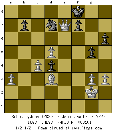 Last move : 1/2-1/2 2011 May 3 8:34:31 [Event "FICGS__CHESS__RAPID_A__000101"] [Site "FICGS"] [Date "2011.03.01"] [Round "1"] [White "Schutte,John"] [Black "Jabot,Daniel"] [Result "1/2-1/2"] [WhiteElo "2020"] [BlackElo "1922"] 1.e4 c5 2.Nf3 d6 3.d4 cxd4 4.Nxd4 Nf6 5.Nc3 a6 6.Be3 e5 7.Nb3 Be6 8.Be2 Be7 9.Qd3 O-O 10.O-O Nbd7 11.Nd5 Bxd5 12.exd5 Nc5 13.Nxc5 dxc5 14.c4 e4 15.Qc2 Qc7 16.g3 Rae8 17.Rae1 Bd6 18.Kg2 Re7 19.Bg5 Be5 20.f3 h6 21.Bc1 Bd4 22.fxe4 Nxe4 23.Bd3 Nf6 24.b3 Qd8 25.Qd1 Rfe8 26.Rxe7 Rxe7 27.Re1 Kf8 28.Rxe7 Qxe7 29.a3 Be3 30.Bb2 Bd4 31.Bxd4 cxd4 32.b4 a5 33.Qd2 g5 34.h3 axb4 35.Qxb4 Nd7 36.Qxe7+ 1/2-1/2 Sicilian : Najdorf, Byrne (English) attack Kingside Castling by player Black (move 9) Kingside Castling by player White (move 10) This chess game ended in a draw. Follow this game move after move (download)If your opponent cannot do anything active, then don't rush the position; instead you should let him sit there, suffer, and beg you for a draw. (Jeremy Silman) Meine Liebe ist Schach, Schach, Schach. Ich muss jeden Tag Schach spielen, deshalb fühle ich mich so stark. (Miguel Najdorf) El Ajedrez es el juego mas altamente simbólico, pero las agresiones estan por lo tanto aún mas francamente representadas en la partida. Tal vez comenzo como un juego de guerra; Algo como la representación de una batalla en miniatura entre las fuerzas de dos reinos. (Karl Meninger) La guerre est enfant de la passion, la passion est enfant du narcissisme et le narcissisme est l'enfant. (...) Une autre partie ? (Thibault de Vassal) The next best thing to gambling and winning is gambling and loosing. (Nick Dandalos)