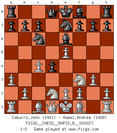 Last move : 1-0 2007 January 22 12:53:49 [Event "FICGS__CHESS__RAPID_B__000027"] [Site "FICGS"] [Date "2006.12.12"] [Round "1"] [White "Caburro,John"] [Black "Humel,Andrea"] [Result "1-0"] [WhiteElo "1461"] [BlackElo "1468"] 1.d4 d5 2.c4 e5 3.dxe5 d4 4.Nf3 Nc6 5.a3 Be6 6.Nbd2 Nge7 7.g3 1-0 This chess game has been lost on time (started : 2006.12.12 8:58:26) QGD : Albin counter-gambit Player White won this chess game. Follow this game move after move (download)Chess holds its master in its own bonds, shackling the mind and brain so that the inner freedom of the very strongest must suffer. (Albert Einstein) Kleine Schachspieler machen Mist, und große Schachspieler machen Mist, aber große machen weniger Mist. (Fritz Sämisch) Cuando veas una buena jugada, trata de encontrar otra mejor. (Emanuel Lasker) Tout change constamment, y compris dans le monde des Echecs. (Botvinnik) Wawaweewa ! (Borat: Cultural learnings of America for make benefit glorious nation of Kazakhstan)