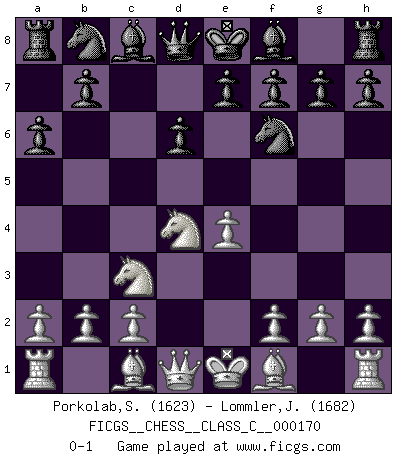 Last move : 0-1 2011 April 14 15:30:25 [Event "FICGS__CHESS__CLASS_C__000170"] [Site "FICGS"] [Date "2011.03.02"] [Round "1"] [White "Porkolab,Sandor"] [Black "Lommler,Jan Peter"] [Result "0-1"] [WhiteElo "1623"] [BlackElo "1682"] 1.e4 c5 2.Nf3 d6 3.d4 cxd4 4.Nxd4 Nf6 5.Nc3 a6 0-1 This chess game has been lost on time (started : 2011.03.02 0:37:57) Sicilian : Najdorf Player Black won this chess game. Follow this game move after move (download)What is the difference between chess and football? Everybody understands football, but nobody plays it. Everybody plays chess, but nobody understands it. Everything is relative. (Vladimir Kramnik) Um sich vor der Gefahr einer Erkältung zu schützen, sorge der wanderlustige König beizeiten für ein brauchbares Versteck. (Aaron Nimzowitsch) ¿Cual es el objetivo de jugar una apertura de gambito?... Para adquirir una reputación de ser un jugador apuesto a costo de perder el juego. (Siegbert Tarrasch) Aidez vos pièces, elles vous aideront. (Paul Morphy) Some people are so afraid to die that they never begin to live. (Henry Van Dyke)
