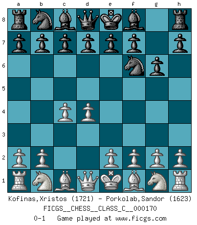 Last move : 0-1 2011 April 24 4:21:26 [Event "FICGS__CHESS__CLASS_C__000170"] [Site "FICGS"] [Date "2011.03.02"] [Round "1"] [White "Kofinas,Xristos"] [Black "Porkolab,Sandor"] [Result "0-1"] [WhiteElo "1721"] [BlackElo "1623"] 1.d4 Nf6 2.c4 g6 0-1 This chess game has been lost on time (started : 2011.03.02 0:37:57) King's Indian defense Player Black won this chess game. Follow this game move after move (download)Chess is a terrible game. If you have no center, your opponent has a freer position. If you do have a center, then you really have something to worry about ! (Siegbert Tarrasch) Kleine Schachspieler machen Mist, und große Schachspieler machen Mist, aber große machen weniger Mist. (Fritz Sämisch) Sin errores no puede haber brillantez. (Emanuel Lasker) Le jeu d'échecs est comme rejeté hors du temps. (Antoine de Saint-Exupéry) For to win one hundred victories in one hundred battles is not the acme of skill. To subdue the enemy without fighting is the acme of skill. (Sun Tzu)