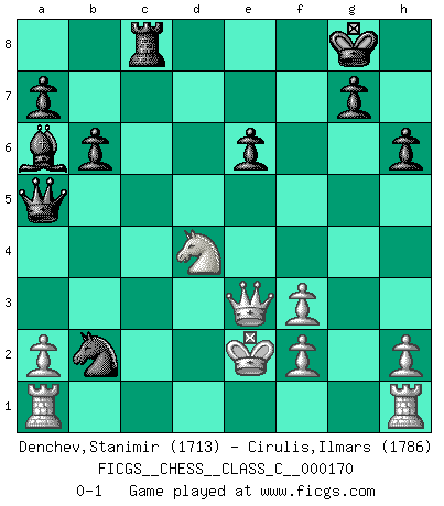 Last move : 0-1 2011 May 20 11:39:12 [Event "FICGS__CHESS__CLASS_C__000170"] [Site "FICGS"] [Date "2011.03.02"] [Round "1"] [White "Denchev,Stanimir"] [Black "Cirulis,Ilmars"] [Result "0-1"] [WhiteElo "1713"] [BlackElo "1786"] 1.d4 f5 2.Nf3 e6 3.c4 h6 4.Nc3 Nf6 5.Qc2 b6 6.e4 fxe4 7.Nxe4 Bb4+ 8.Bd2 Bxd2+ 9.Nfxd2 O-O 10.Bd3 Nxe4 11.Bxe4 d5 12.Bf3 Nc6 13.Nb3 Ba6 14.cxd5 Nb4 15.Qd2 Nd3+ 16.Kd1 Rxf3 17.gxf3 Qxd5 18.Kc2 Qf5 19.Kc3 c5 20.Qe3 cxd4+ 21.Nxd4 Rc8+ 22.Kd2 Qa5+ 23.Ke2 Nxb2 0-1 Dutch Kingside Castling by player Black (move 9) Player Black won this chess game. Follow this game move after move (download)We must make sure that Chess will not be like a dead language, very interesting, but for a very small group. (Sytze Faber) Vielleicht wirkt die Aura früherer Spieler glanzvoller als die der heutigen Spieler, aber das liegt daran, dass man kein Programm wie Fritz hatte, das einem all die Löcher in ihren Partien zeigt. (Vladimir Kramnik) Debió haber existido una vez en que los hombres eran semidióses, de otra manera no hubiesen podido inventar el Ajedrez. (Gustav Schenk) La conception d'un plan est le processus par lequel un joueur exploite les avantages de sa position tout en s'efforçant d'en réduire au minimum les inconvénients. Afin de garantir le succès, un plan doit toujours se fonder sur un diagnostic objectif des particularités d'une position. La conception d'un plan est d'autant plus difficile que la position est équilibrée, et grandement facilitée lorsqu'il n'existe qu'un seul plan susceptible de répondre aux exigences de la position. (Harry Golombek) Don't anthropomorphize computers - they hate it. (Anonymous)
