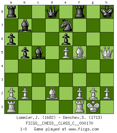 Last move : 1-0 2011 May 20 11:39:35 [Event "FICGS__CHESS__CLASS_C__000170"] [Site "FICGS"] [Date "2011.03.02"] [Round "1"] [White "Lommler,Jan Peter"] [Black "Denchev,Stanimir"] [Result "1-0"] [WhiteElo "1682"] [BlackElo "1713"] 1.d4 d5 2.c4 c6 3.Nf3 Nf6 4.Nc3 e6 5.e3 Be7 6.Bd3 dxc4 7.Bxc4 b5 8.Bd3 a6 9.O-O O-O 10.e4 Bb7 11.e5 Nd5 12.Ne4 Nd7 13.Bd2 c5 14.Nxc5 Nxc5 15.dxc5 Bxc5 16.Bxh7+ Kh8 17.Ng5 g6 18.Qg4 Kg7 19.Bxg6 Ne7 20.Nxe6+ fxe6 21.Bf5 Kh8 22.Qh5+ 1-0 QGD Slav : 4.Nc3 Kingside Castling by player White (move 9) Kingside Castling by player Black (move 9) Player White won this chess game. Follow this game move after move (download)Life is like a game of Chess, changing with each move. (Chinese proverb) Wenn ich Weiß habe gewinne ich weil ich Weiß habe, wenn ich Schwarz habe gewinne ich weil ich Bogoljubov bin. (Efim Bogoljubov) Si el ingenio solamente fuese necesario para lucirse, las mujeres serían las mejores jugadoras de Ajedrez del mundo. (Albin) Même si vous avez un bon coup à faire, regardez toujours s'il n'y en a pas un qui lui soit préférable. (Pedro Damiano) Statistics can be made to prove anything - even the truth. (Author unknown)