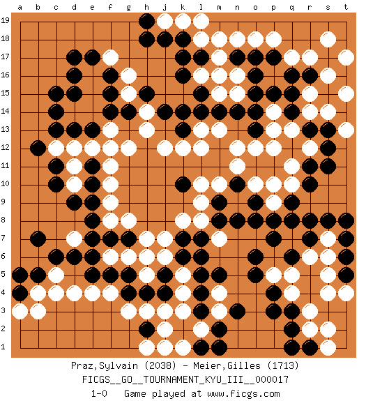 Last move : 1-0 2011 March 24 16:4:0 [Event "FICGS__GO__TOURNAMENT_KYU_III__000017"] [Site "FICGS"] [Date "2011.03.02"] [Round "1"] [Black "Praz,Sylvain"] [White "Meier,Gilles"] [Result "1-0"] [Rating 1 "2038"] [Rating 2 "1713"] 1.r16 d4 2.d17 q4 3.c6 f4 4.c11 p16 5.q14 r17 6.s17 q17 7.m16 r15 8.q15 s16 9.q16 s18 10.p17 p18 11.o17 o18 12.n17 q10 13.q8 r6 14.s8 r14 15.s15 t17 16.r13 s14 17.s13 t15 18.q12 o10 19.o8 m10 20.q3 r3 21.p3 r2 22.p4 q5 23.l4 j3 24.k10 n12 25.m8 l12 26.d15 m17 27.l17 m18 28.k16 n18 29.o15 p13 30.r11 q13 31.o14 n16 32.o16 n15 33.o13 p12 34.m14 m15 35.l15 l16 36.n14 m16 37.k14 o12 38.r10 q11 39.q9 p9 40.p8 n9 41.n8 l13 42.l14 j12 43.e6 g12 44.g14 c4 45.k18 f10 46.e10 f11 47.e9 e12 48.d13 h7 49.b5 b4 50.k2 k3 51.l3 j2 52.q2 f8 53.e8 l9 54.k7 k8 55.k6 h5 56.t5 s4 57.o6 s7 58.t7 s5 59.r7 s6 60.t6 t4 61.t8 t13 62.s12 e14 63.e13 f13 64.f14 d14 65.c14 d12 66.c13 c12 67.b12 d11 68.c10 d10 69.d9 d7 70.d6 f9 71.e7 q7 72.r8 l2 73.m2 p5 74.o5 l18 75.k17 l8 76.l7 j7 77.l1 h14 78.h15 g15 79.j14 e15 80.c15 h13 81.f15 g16 82.f16 p14 83.p15 r12 84.s11 k19 85.j18 j19 86.h19 l19 87.h18 k5 88.l5 k4 89.a4 a3 90.a5 b3 91.j1 h1 92.h2 k1 93.r1 s1 94.q1 s2 95.j1 e16 96.e17 k1 97.e11 f12 98.j1 f17 99.d16 k1 100.f5 l2 101.g4 e4 102.k2 j1 103.g5 g3 104.h4 h3 105.h6 j6 106.j5 g6 107.g7 h5 108.f7 g8 109.h6 l2 110.m1 h5 111.k13 k12 112.h6 m7 113.l6 h5 114.j4 h6 115.p7 f6 116.e5 c5 117.b7 m13 118.o9 p10 119.m9 l10 120.n10 n11 121.q6 m3 122.n3 m4 123.m5 1-0 Here are the names of the openings (joseki) played in the four corners : Corner d4 : d4 c6 Hoshi (Hwajeom, Seongjeom, Xingwei`) 4-4 Point. The star or hoshi (4-4) point, emphasizing influence at the potential expense of territory. Ikken Kakari (Hankan Keolch'im, Yi Gua`jiao~, 1-Space Low Approach). Black 2 is the standard approach move to the 4-4. Corner q16 : r16 p16 Komoku (Somok, Xiao~mu`) 3-4 Point. The komoku (3-4) point is the traditional corner enclosure move.. Ikken Takagakari (Hankan Nop'dakeolch'im, Yi Gaogua`jiao~, 1-Space High Approach). The 5-4 approach move has become more popular in modern times, as modern Go emphasizes speed and influence. Corner q4 : q4 q8 Hoshi (Hwajeom, Seongjeom, Xingwei`) 4-4 Point. The star or hoshi (4-4) point, emphasizing influence at the potential expense of territory. Player Black won this Go (weiqi, baduk) game. Follow this game move after move (download)Take the cutting stone on the second line. (Anonymous) Over-the-board chess is the favorite of mortals, correspondence chess is the favorite of the gods. (Eduard Dyckhoff)