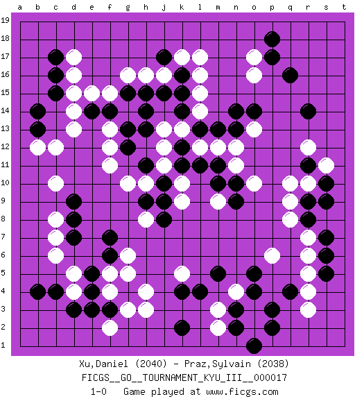 Last move : 1-0 2011 April 29 15:59:24 [Event "FICGS__GO__TOURNAMENT_KYU_III__000017 "] [Site "FICGS"] [Date "2011.03.02"] [Round "1"] [Black "Xu,Daniel "] [White "Praz,Sylvain "] [Result "1-0"] [Rating 1 "2040"] [Rating 2 "2038"] 1.q16 d4 2.q4 d17 3.f3 c6 4.k4 o17 5.r14 l16 6.c15 d13 7.c17 d16 8.c16 d15 9.b13 r6 10.r8 o3 11.o4 n4 12.o5 r3 13.p3 r4 14.n3 r10 15.s5 r5 16.s6 r7 17.s7 q8 18.r9 q9 19.s10 s11 20.r11 q10 21.s9 r12 22.p17 o16 23.p18 p6 24.k16 k17 25.j17 j16 26.k15 l17 27.j15 h16 28.h15 g16 29.g15 f15 30.f14 e15 31.g13 f12 32.h11 b12 33.b14 c12 34.f6 o2 35.p2 m3 36.n2 m2 37.o1 h3 38.k2 f4 39.g4 g3 40.e4 f5 41.e5 g5 42.d3 f2 43.e3 h4 44.c4 d5 45.d7 c7 46.d8 c8 47.d9 c10 48.m5 k5 49.l4 g6 50.f7 h8 51.b4 j13 52.g12 f11 53.k12 k13 54.l13 l14 55.k14 l12 56.m13 j12 57.k11 j11 58.j10 k10 59.l11 h10 60.j9 k9 61.h9 g10 62.j8 m12 63.m11 n12 64.n13 n11 65.m10 m9 66.n10 o13 67.n14 o10 68.n9 l15 69.o14 f13 70.e14 g14 71.h14 d14 72.h13 1-0 Here are the names of the openings (joseki) played in the four corners : Corner d4 : d4 f3Hoshi (Hwajeom, Seongjeom, Xingwei`) 4-4 Point. The star or hoshi (4-4) point, emphasizing influence at the potential expense of territory.Ikken Kakari (Hankan Keolch'im, Yi Gua`jiao~, 1-Space Low Approach). Black 2 is the standard approach move to the 4-4. Corner q16 : q16 o17Hoshi (Hwajeom, Seongjeom, Xingwei`) 4-4 Point. The star or hoshi (4-4) point, emphasizing influence at the potential expense of territory.Ikken Kakari (Hankan Keolch'im, Yi Gua`jiao~, 1-Space Low Approach). White 2 is the standard approach move to the 4-4. Corner d16 : d17 c15Komoku (Somok, Xiao~mu`) 3-4 Point. The komoku (3-4) point is the traditional corner enclosure move..Ikken Kakari (Hankan Keolch'im, Yi Gua`jiao~, 1-Space Low Pincer). The small knight move is the basic approach move to the 3-4 point stone. It has been continually used for over four centuries. There are limitless variations, with new moves constantly being discovered. Black 2 opens the door to a treaure store of joseki. Corner q4 : q4 r6Hoshi (Hwajeom, Seongjeom, Xingwei`) 4-4 Point. The star or hoshi (4-4) point, emphasizing influence at the potential expense of territory.Ikken Kakari (Hankan Keolch'im, Yi Gua`jiao~, 1-Space Low Approach). White 2 is the standard approach move to the 4-4. Player Black won this Go (weiqi, baduk) game.Follow this game move after move (download ) Pon-nuki is worth thirty points. (Anonymous) When it is a question of money, everybody is of the same religion. (Voltaire)