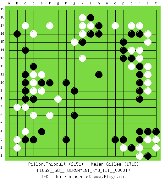 Last move : 1-0 2011 April 24 0:18:23 [Event "FICGS__GO__TOURNAMENT_KYU_III__000017 "] [Site "FICGS"] [Date "2011.03.02"] [Round "1"] [Black "Pillon,Thibault "] [White "Meier,Gilles "] [Result "1-0"] [Rating 1 "2151"] [Rating 2 "1713"] 1.q16 c4 2.r4 d16 3.e4 d6 4.c3 b3 5.h3 o17 6.c14 f17 7.c8 c7 8.d8 r14 9.p15 r17 10.q13 r13 11.r16 q17 12.r12 q14 13.p14 q12 14.p13 s12 15.r11 s11 16.r10 s10 17.r9 s9 18.r8 s15 19.o3 k16 20.d12 f6 21.b16 c17 22.j6 g8 23.j9 k13 24.m11 d10 25.e10 e11 26.c10 e9 27.f10 d9 28.c9 d11 29.c11 b7 30.m17 l17 31.m16 s16 32.l18 k18 33.l16 k17 34.k15 j15 35.d3 b2 36.h10 s3 37.r3 r2 38.q2 r1 39.s4 t2 40.t4 t3 41.s1 p2 42.p3 1-0 Here are the names of the openings (joseki) played in the four corners : Corner d4 : c4 e4Komoku (Somok, Xiao~mu`) 3-4 Point. The komoku (3-4) point is the traditional corner enclosure move..Ikken Takagakari (Hankan Nop'dakeolch'im, Yi Gaogua`jiao~, 1-Space High Approach). The 5-4 approach move has become more popular in modern times, as modern Go emphasizes speed and influence. Corner q16 : q16 o17Hoshi (Hwajeom, Seongjeom, Xingwei`) 4-4 Point. The star or hoshi (4-4) point, emphasizing influence at the potential expense of territory.Ikken Kakari (Hankan Keolch'im, Yi Gua`jiao~, 1-Space Low Approach). White 2 is the standard approach move to the 4-4. Corner d16 : d16 c14Hoshi (Hwajeom, Seongjeom, Xingwei`) 4-4 Point. The star or hoshi (4-4) point, emphasizing influence at the potential expense of territory.Ikken Kakari (Hankan Keolch'im, Yi Gua`jiao~, 1-Space Low Approach). Black 2 is the standard approach move to the 4-4. Player Black won this Go (weiqi, baduk) game.Follow this game move after move (download ) If there is no stone on the handicap point, the carpenter's square is dead. (Anonymous) Being number two sucks. (Andre Agassi)