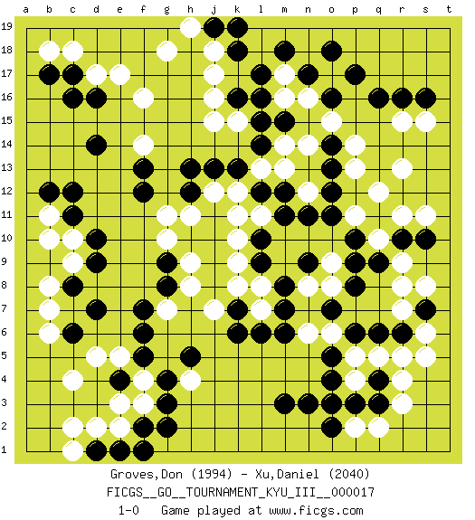 Last move : 1-0 2011 April 25 8:30:3 [Event "FICGS__GO__TOURNAMENT_KYU_III__000017"] [Site "FICGS"] [Date "2011.03.02"] [Round "1"] [Black "Groves,Don"] [White "Xu,Daniel"] [Result "1-0"] [Rating 1 "1994"] [Rating 2 "2040"] 1.q16 c4 2.d16 r4 3.e4 h4 4.d7 e5 5.f5 d5 6.f6 f4 7.g4 f3 8.g3 e3 9.h5 f16 10.k16 f14 11.d14 d17 12.c17 e17 13.p3 p4 14.o4 p5 15.q3 r3 16.o5 o6 17.m3 n6 18.r10 r8 19.n17 c18 20.c11 r13 21.p10 p13 22.o12 n14 23.m12 o17 24.o16 n16 25.p17 o15 26.o18 m16 27.l17 c9 28.d9 c10 29.d10 b11 30.c12 b7 31.c8 b8 32.o13 p14 33.l14 r15 34.r16 s15 35.s16 s11 36.s10 r11 37.q11 q12 38.l6 l7 39.k7 k8 40.m7 l8 41.m6 j7 42.k6 k10 43.n9 k12 44.f12 h9 45.b12 b10 46.c16 b18 47.h12 m13 48.p6 o8 49.q4 q5 50.q6 r5 51.p8 o9 52.r6 o3 53.o2 p2 54.n3 q2 55.o3 n8 56.p9 s6 57.s7 s5 58.m8 r7 59.o7 s8 60.k13 k15 61.l12 j12 62.l9 k9 63.j13 h11 64.c6 b6 65.f13 g7 66.f7 m14 67.l10 l13 68.l15 m17 69.m18 j15 70.l16 j16 71.h13 g11 72.g8 h8 73.g9 g10 74.g2 j17 75.b17 n12 76.n11 l11 77.m11 k11 78.k18 j18 79.j19 h19 80.k19 g18 81.d1 d2 82.f2 e2 83.e1 c1 84.f1 c2 85.m15 p11 86.o11 q10 87.q9 r9 88.o14 1-0 Here are the names of the openings (joseki) played in the four corners : Corner d4 : c4 e4 Komoku (Somok, Xiao~mu`) 3-4 Point. The komoku (3-4) point is the traditional corner enclosure move.. Ikken Takagakari (Hankan Nop'dakeolch'im, Yi Gaogua`jiao~, 1-Space High Approach). The 5-4 approach move has become more popular in modern times, as modern Go emphasizes speed and influence. Corner d16 : d16 f16 Hoshi (Hwajeom, Seongjeom, Xingwei`) 4-4 Point. The star or hoshi (4-4) point, emphasizing influence at the potential expense of territory. Ikken Takagakari (Hankan Nop'dakeolch'im, Yi Gaojia, 1-Space High Approach). Black typically responds at 6-4 or 3-10. Black 4-10 is played when Black finds play on the right side advantageous. Black 4-8 or 3-8 may be played when Black has support at top. Corner q4 : r4 p3 Komoku (Somok, Xiao~mu`) 3-4 Point. The komoku (3-4) point is the traditional corner enclosure move.. Ikken Kakari (Hankan Keolch'im, Yi Gua`jiao~, 1-Space Low Pincer). The small knight move is the basic approach move to the 3-4 point stone. It has been continually used for over four centuries. There are limitless variations, with new moves constantly being discovered. Black 2 opens the door to a treaure store of joseki. Player Black won this Go (weiqi, baduk) game. Follow this game move after move (download)Beware of the clumsy double contact. (Anonymous) Establishing goals is all right if you don't let them deprive you of interesting detours. (Doug Larson)