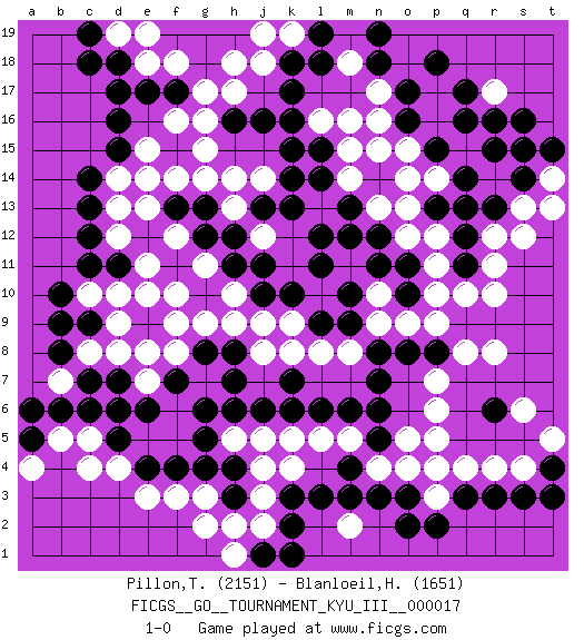Last move : 1-0 2011 August 6 11:19:42 [Event "FICGS__GO__TOURNAMENT_KYU_III__000017"] [Site "FICGS"] [Date "2011.03.02"] [Round "1"] [Black "Pillon,Thibault"] [White "Blanloeil,Hugues"] [Result "1-0"] [Rating 1 "2151"] [Rating 2 "1651"] 1.q16 q4 2.d17 d4 3.c6 f3 4.c12 r14 5.o16 r11 6.r6 r8 7.o3 p5 8.r3 r4 9.q3 p7 10.s3 s4 11.d15 j3 12.k17 c5 13.d6 d9 14.f7 f9 15.b9 c8 16.b8 e11 17.c9 d8 18.d5 c4 19.g4 g3 20.h7 h9 21.l3 g17 22.s16 r17 23.r16 p17 24.q17 p16 25.p15 n17 26.o17 m16 27.k15 m14 28.k13 e18 29.d18 j18 30.k18 l16 31.k16 g15 32.g13 j14 33.k14 h13 34.h12 g14 35.j13 h14 36.g12 e14 37.q12 r12 38.e12 d13 39.c13 d12 40.f11 e10 41.k7 k9 42.m12 n13 43.n12 o13 44.q13 o12 45.o11 p11 46.q14 p12 47.m10 l8 48.n7 m8 49.n8 n9 50.m9 o9 51.j10 j9 52.d11 e13 53.k10 h10 54.l9 k8 55.f13 f14 56.c11 f12 57.t4 t5 58.t3 s6 59.e12 j12 60.j11 f12 61.l11 g11 62.h11 f10 63.q11 r10 64.k2 k4 65.n5 b7 66.b6 b5 67.c7 j2 68.j1 h1 69.k1 g2 70.r13 s13 71.s14 s12 72.e4 e3 73.f4 d19 74.c19 e19 75.c18 k19 76.l19 j19 77.l18 p3 78.p2 o4 79.n3 n4 80.m4 m5 81.m6 l5 82.l6 m2 83.m3 q10 84.e17 f18 85.f17 h18 86.o10 p10 87.n18 t14 88.s15 n16 89.k3 j5 90.j6 h5 91.g5 m18 92.n19 o15 93.p18 p14 94.k6 k5 95.p4 o5 96.n6 p6 97.h4 j4 98.h3 h2 99.g6 n10 100.n11 l13 101.l12 d14 102.c14 e15 103.d16 f16 104.h16 h17 105.j16 g16 106.o8 p9 107.p8 q8 108.t15 t13 109.a5 a4 110.a6 d10 111.l14 n15 112.m13 c10 113.b10 p3 114.o2 e7 115.e6 f8 116.g8 g9 117.d7 e8 118.l15 m15 119.r15 p4 120.p13 o14 121.h8 j8 122.h6 1-0 Here are the names of the openings (joseki) played in the four corners : Corner d4 : d4 c6 Hoshi (Hwajeom, Seongjeom, Xingwei`) 4-4 Point. The star or hoshi (4-4) point, emphasizing influence at the potential expense of territory. Ikken Kakari (Hankan Keolch'im, Yi Gua`jiao~, 1-Space Low Approach). Black 2 is the standard approach move to the 4-4. Corner q16 : q16 r14 Hoshi (Hwajeom, Seongjeom, Xingwei`) 4-4 Point. The star or hoshi (4-4) point, emphasizing influence at the potential expense of territory. Ikken Kakari (Hankan Keolch'im, Yi Gua`jiao~, 1-Space Low Approach). White 2 is the standard approach move to the 4-4. Corner q4 : q4 r6 Hoshi (Hwajeom, Seongjeom, Xingwei`) 4-4 Point. The star or hoshi (4-4) point, emphasizing influence at the potential expense of territory. Ikken Kakari (Hankan Keolch'im, Yi Gua`jiao~, 1-Space Low Approach). Black 2 is the standard approach move to the 4-4. Player Black won this Go (weiqi, baduk) game. Follow this game move after move (download)Go uses the most elemental materials and concepts - line and circle, wood and stone, black and white - combining them with simple rules to generate subtle strategies and complex tactics that stagger the imagination. (Iwamoto Kaoru, 9 dan professional Go player and former Honinbo title holder) Games, world of games... There's always an opponent, and there's always a victim. (Revolver, movie)