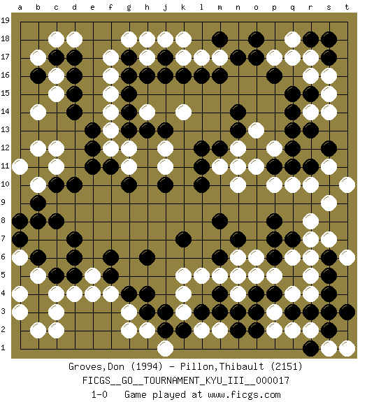 Last move : 1-0 2011 July 16 15:42:11 [Event "FICGS__GO__TOURNAMENT_KYU_III__000017"] [Site "FICGS"] [Date "2011.03.02"] [Round "1"] [Black "Groves,Don"] [White "Pillon,Thibault"] [Result "1-0"] [Rating 1 "1994"] [Rating 2 "2151"] 1.p16 r4 2.d16 c4 3.d7 e4 4.d10 r16 5.q14 r14 6.q13 p17 7.o17 q17 8.q15 s14 9.p4 n4 10.p6 r6 11.p8 r8 12.r3 s3 13.q3 k3 14.s2 f17 15.k16 f15 16.d14 d18 17.c17 j18 18.h4 g3 19.h3 k5 20.h6 c12 21.e13 b14 22.b11 c11 23.c10 c15 24.d15 b12 25.e11 b10 26.b9 a11 27.k7 n6 28.m8 h14 29.h16 h17 30.g16 f16 31.g17 g18 32.j17 h18 33.g15 f14 34.g14 f13 35.g13 f12 36.e12 k17 37.j16 l17 38.l16 m17 39.m16 q10 40.r11 r10 41.q11 p10 42.p11 n10 43.n3 o5 44.o4 p5 45.q5 q6 46.m4 m5 47.n5 o6 48.m6 o11 49.o12 h2 50.j2 g2 51.j3 j1 52.k2 n12 53.n13 l5 54.p7 q4 55.n7 n4 56.s4 r5 57.r15 s15 58.m12 n11 59.l10 m11 60.s10 s9 61.l12 p3 62.o3 p2 63.l3 r2 64.t3 q2 65.s3 k4 66.s5 m2 67.m3 l2 68.n2 s1 69.s6 s7 70.q7 r7 71.l11 s11 72.s12 t10 73.o18 g11 74.f11 g12 75.g10 j12 76.j10 k14 77.s17 r17 78.r18 q18 79.g4 f4 80.f5 e5 81.f6 c6 82.d6 c7 83.d5 d4 84.c5 b5 85.h13 r12 86.s18 s16 87.r13 p12 88.q12 o13 89.n14 j11 90.j13 c18 91.c8 n5 92.b6 b7 93.b4 a6 94.b3 c2 95.a8 b2 96.a7 c3 97.b8 t6 98.r1 t1 99.o2 a4 100.b6 a3 101.n17 b17 102.m18 k18 103.b16 c16 104.d17 1-0 Here are the names of the openings (joseki) played in the four corners : Corner d4 : c4 d7 Komoku (Somok, Xiao~mu`) 3-4 Point. The komoku (3-4) point is the traditional corner enclosure move.. Corner q16 : p16 r16 Takamoku (Gomok, Gaomu`) 5-4 Point. The takamoku (high) point (5-4). With its emphasis on influence, the 5-4 point complements the 4-4 (hoshi) point in creating an influence-oriented fuseki. Komoku. Black responds with 3-3, 3-5, 4-6, 4-7, 3-6, 3-7. Corner q4 : r4 p4 Komoku (Somok, Xiao~mu`) 3-4 Point. The komoku (3-4) point is the traditional corner enclosure move.. Ikken Takagakari (Hankan Nop'dakeolch'im, Yi Gaogua`jiao~, 1-Space High Approach). The 5-4 approach move has become more popular in modern times, as modern Go emphasizes speed and influence. Corner d16 : d16 f17 Hoshi (Hwajeom, Seongjeom, Xingwei`) 4-4 Point. The star or hoshi (4-4) point, emphasizing influence at the potential expense of territory. Ikken Kakari (Hankan Keolch'im, Yi Gua`jiao~, 1-Space Low Approach). White 2 is the standard approach move to the 4-4. Player Black won this Go (weiqi, baduk) game. Follow this game move after move (download)Error is one of the sources of transformation. (Pierre Audouard) Always be a first-rate version of yourself, instead of a second-rate version of somebody else. (Judy Garland)