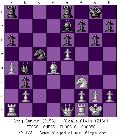 Last move : 1/2-1/2 2011 October 12 15:45:35 [Event "FICGS__CHESS__CLASS_A__000090"] [Site "FICGS"] [Date "2011.03.02"] [Round "1"] [White "Gray,Garvin"] [Black "Alcala,Alvin"] [Result "1/2-1/2"] [WhiteElo "2156"] [BlackElo "2160"] 1.d4 Nf6 2.c4 c6 3.Nf3 d5 4.e3 e6 5.Bd3 dxc4 6.Bxc4 c5 7.O-O a6 8.Bb3 b5 9.a4 b4 10.e4 Bb7 11.Nbd2 Be7 12.e5 Nfd7 13.Nc4 O-O 14.Bc2 cxd4 15.Qxd4 b3 16.Bb1 Bd5 17.Qd3 g6 18.Bh6 Re8 19.Qe2 Nc5 20.Be3 Nbd7 21.Bd4 Nb6 22.Nxb6 Qxb6 23.Be4 Bxe4 24.Qxe4 Qb4 25.Qe1 1/2-1/2 Queen's pawn game Kingside Castling by player White (move 7) Kingside Castling by player Black (move 13) This chess game ended in a draw. Follow this game move after move (download)Only sissies Castle. (Rob Sillars) Ich könnte leicht behaupten: Ja,ja, Leonid Breschnew wollte nicht, daß ich Weltmeister werde. In der Tat war die Sache komplizierter. (Viktor Kortschnoi) ¿Porque tengo que perder ante este idiota?. (Aron Nimzovich) Horreur, mais aussi harmonie suprême : qu'y avait-il en effet au monde en dehors des échecs ? Le brouillard, l'inconnu, le non-être... (Vladimir Nabokov) It's unlucky to be superstitious. (Dave Enteles)