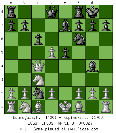 Last move : 0-1 2006 December 16 0:50:51 [Event "FICGS__CHESS__RAPID_B__000027"] [Site "FICGS"] [Date "2006.12.12"] [Round "1"] [White "Benreguia,Frederic"] [Black "Kepinski,Janusz"] [Result "0-1"] [WhiteElo "1400"] [BlackElo "1700"] 1.Nf3 d5 2.e3 Nf6 3.Nd4 e5 4.Nb5 c6 5.N5c3 Be7 6.Qf3 O-O 7.e4 Bg4 8.Qd3 Na6 9.exd5 Nb4 10.Qc4 Nxc2+ 0-1 Reti Opening Kingside Castling by player Black (move 6) Player Black won this chess game. Follow this game move after move (download)Nothing excites jaded Grandmasters more than a theoretical novelty. (Dominic Lawson) Wer wird heute Abend ihr Gegner sein? -- Heute Abend spiele ich gegen die schwarzen Steine. (Akiba Rubinstein) Tu puedes aprender mucho mas de una partida que pierdas que de una partida ganada. Tendras que perder cientos de partidas antes de llegar a ser un buen jugador. (Jose Raul Capablanca) La vie et les Echecs sont tous les deux une lutte constante. (Lasker) You must do what you feel is right... of course. (Obi-Wan Kenobi in Star Wars ep.4)