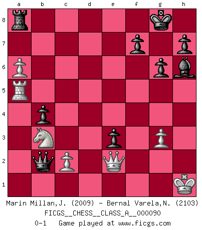 Last move : 0-1 2011 November 30 14:31:50 [Event "FICGS__CHESS__CLASS_A__000090"] [Site "FICGS"] [Date "2011.03.17"] [Round "1"] [White "Marin Millan,Jose Antonio"] [Black "Bernal Varela,Nelson"] [Result "0-1"] [WhiteElo "2009"] [BlackElo "2103"] 1.e4 c5 2.Nf3 d6 3.d4 cxd4 4.Nxd4 Nf6 5.Nc3 a6 6.Be3 e5 7.Nb3 Be6 8.f3 Nbd7 9.Qd2 b5 10.h4 Nb6 11.Bxb6 Qxb6 12.a4 b4 13.Nd5 Nxd5 14.exd5 Bc8 15.a5 Qb7 16.f4 Bg4 17.h5 Be7 18.h6 g6 19.Ra4 Rb8 20.fxe5 dxe5 21.d6 Qe4+ 22.Kf2 Qf5+ 23.Kg1 Bg5 24.Qf2 e4 25.Bxa6 Qe5 26.Be2 e3 27.Qf1 Bxe2 28.Qxe2 O-O 29.Ra1 Qxd6 30.a6 Rfe8 31.Rh3 Ra8 32.Kh1 Re6 33.Ra5 Rf6 34.Rf3 Bxh6 35.Rxf6 Qxf6 36.g3 Qxb2 0-1 This chess game has been lost on time (started : 2011.03.17 11:33:52) Sicilian : Najdorf, Byrne (English) attack Kingside Castling by player Black (move 28) Player Black won this chess game. Follow this game move after move (download)The Pin is mightier than the sword. (Fred Reinfeld) Das Schach hält seine Meister in eigenen Banden, Fesseln; auf vielerlei Weise formt es ihren Geist, so dass die innere Freiheit selbst des Stärksten beeinflusst wird. (Albert Einstein) La caracteristica mas importante en la posición del Ajedrez es la actividad de las piezas. Esto es absolutamente fundamental en todas las fases del juego: Apertura, Juego Medio y especialmente Finales. La limitación primordial en la actividad de una pieza, es la estructuración de los Peones. (Michael Stean) Le pion, dans sa simplicité, marche droit devant lui, mais lorsqu'il prend, il le fait obliquement? Ainsi l'homme, tant qu'il reste pauvre, marche dans la droiture et vit honnêtement, mais lorsqu'il recherche les honneurs, il flatte, se parjure et, par les voies obliques, cherche une position supérieure sur l'échiquier du monde. (Jean de Galles) We're missing something. (Gregory House, House M.D.)