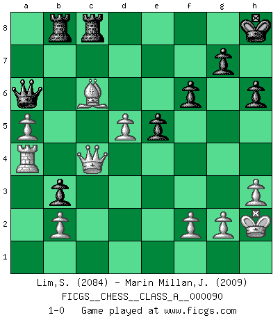 Last move : 1-0 2012 January 15 6:14:19 [Event "FICGS__CHESS__CLASS_A__000090"] [Site "FICGS"] [Date "2011.03.17"] [Round "1"] [White "Lim,Steve"] [Black "Marin Millan,Jose Antonio"] [Result "1-0"] [WhiteElo "2084"] [BlackElo "2009"] 1.e4 e5 2.Nf3 Nc6 3.Bb5 a6 4.Ba4 Nf6 5.O-O Be7 6.Re1 b5 7.Bb3 d6 8.c3 O-O 9.h3 Nb8 10.d4 Nbd7 11.c4 c6 12.Nc3 Qc7 13.cxb5 axb5 14.Qc2 Ba6 15.Be3 b4 16.Nd5 Nxd5 17.exd5 c5 18.dxc5 dxc5 19.Rac1 Qd6 20.Red1 Rac8 21.Ba4 Rfd8 22.Ng5 Bxg5 23.Bxg5 f6 24.Be3 c4 25.Bc6 Nc5 26.Bxc5 Qxc5 27.Qa4 Qb6 28.Re1 Rc7 29.a3 b3 30.Rxc4 Bxc4 31.Qxc4 Kf8 32.a4 Rb8 33.Re4 R7c8 34.Rh4 h6 35.Qc3 Qa6 36.Rc4 Rd8 37.a5 Kg8 38.Kh2 Kh8 39.Ra4 Rdc8 40.Qc4 1-0 This chess game has been lost on time (started : 2011.03.17 11:33:52) Ruy Lopez : Closed Kingside Castling by player White (move 5) Kingside Castling by player Black (move 8) Player White won this chess game. Follow this game move after move (download)Discovered check is the dive bomber of the Chessboard. (Reuben Fine) Ich erzeugte keinen Neid, da mich die Schachspieler als Musiker und die Musiker als Schachspieler betrachteten. (Mark Taimanov) Aquel que toma al Peón de Caballo de la Reina, se pasará la noche a dormir en la calle. (Anónimo) Même un GMI sait rarement calculer sur plus de cinq coups une attaque à sacrifices. (Rudolf Spielmann) Heh, heh, heh. Time to abandon ship. (General Grievous in Star Wars ep.3)