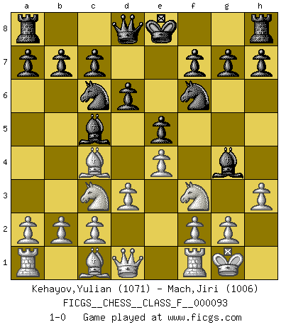 Last move : 1-0 2011 May 14 6:10:7 [Event "FICGS__CHESS__CLASS_F__000093"] [Site "FICGS"] [Date "2011.03.02"] [Round "1"] [White "Kehayov,Yulian"] [Black "Mach,Jiri"] [Result "1-0"] [WhiteElo "1071"] [BlackElo "1006"] 1.e4 e5 2.Nf3 Nc6 3.Nc3 Nf6 4.Bc4 Bc5 5.O-O d6 6.d3 Bg4 7.h3 1-0 This chess game has been lost on time (started : 2011.03.02 13:32:20) Four knights : Italian variation Kingside Castling by player White (move 5) Player White won this chess game. Follow this game move after move (download)There are two types of sacrifices: correct ones and mine. (Mikhail Tal) Im Schach nämlich geht es darum, daß Ich des Gegners klein zu kriegen, sein Ego zu zerbrechen und zu zermahlen, seine Selbstachtung zu zertreten und zu verscharren und seine ganze mißachtenswerte sogenannte Persönlichkeit ein für alle Mal tot zu hacken und zu zerstampfen und dadurch die menschliche Gesellschaft von einer stinkenden Pestbeule zu befreien. Es ist ein königliches Spiel. (Robert James Fischer) Por tratar de evitar la pérdida de una pieza, muchas personas han perdido una partida de Ajedrez. (Savielly Tartakover) On croit qu'il y a plus de mauvais joueurs que de bons joueurs, c'est faux : Il y a autant de joueurs qui gagnent que de joueurs qui perdent. (Philippe Geluck) Now the reason the enlightened prince and the wise general conquer the enemy whenever they move and their achievements surpass those of ordinary men is foreknowledge. (Sun Tzu)