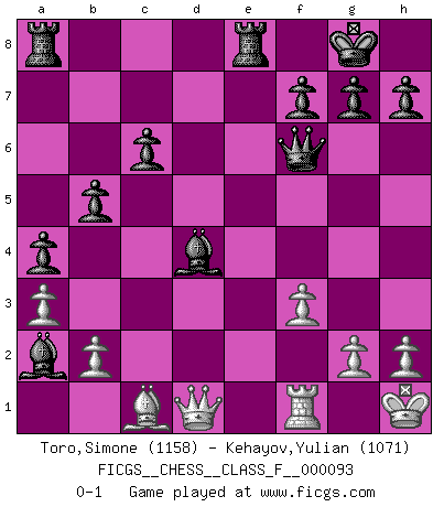 Last move : 0-1 2011 March 25 10:23:40 [Event "FICGS__CHESS__CLASS_F__000093"] [Site "FICGS"] [Date "2011.03.02"] [Round "1"] [White "Toro,Simone"] [Black "Kehayov,Yulian"] [Result "0-1"] [WhiteElo "1158"] [BlackElo "1071"] 1.e4 e5 2.Nf3 Nf6 3.Nc3 Nc6 4.Bb5 Nd4 5.Nxd4 exd4 6.Nd5 c6 7.Nxf6+ Qxf6 8.Bc4 b5 9.Bb3 d3 10.cxd3 Bc5 11.O-O O-O 12.d4 Bxd4 13.d3 a5 14.a3 a4 15.Ba2 Re8 16.Qe2 d5 17.Rb1 dxe4 18.dxe4 Bf5 19.Kh1 Bxe4 20.f3 Bxb1 21.Qd1 Bxa2 0-1 Petrov Three knights game Kingside Castling by player White (move 11) Kingside Castling by player Black (move 11) Player Black won this chess game. Follow this game move after move (download)Of all my Russian books, the defense contains and diffuses the greatest 'warmth' which may seem odd seeing how supremely abstract Chess is supposed to be. (Vladimir Nabokov) Schach sollte überall auf der Welt Schulfach werden. Es fördert die geistige Auseinandersetzung. Es lehrt die Demut in der Niederlage. (Garry Kasparov) Es el objetivo de la escuela moderna no tratar cada posición de acuerdo a una regla general, sino de acuerdo al principio inherente en la posición. (Richard Reti) Les Echecs mettent en conflit, non pas deux intelligences, mais deux volontés. (Lasker) As the days dwindle down... to a precious few. (Maxwell Anderson)