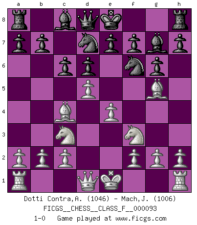 Last move : 1-0 2011 May 5 17:34:52 [Event "FICGS__CHESS__CLASS_F__000093"] [Site "FICGS"] [Date "2011.03.02"] [Round "1"] [White "Dotti Contra,Alessandro"] [Black "Mach,Jiri"] [Result "1-0"] [WhiteElo "1046"] [BlackElo "1006"] 1.e4 d6 2.d4 Nf6 3.Nc3 g6 4.Bg5 Bg7 5.Nf3 c6 6.d5 Nbd7 7.Bc4 1-0 This chess game has been lost on time (started : 2011.03.02 13:32:20) Pirc : Byrne variation Player White won this chess game. Follow this game move after move (download)Pawns: they are the soul of this game, they alone form the attack and defense. (Philidor) Im Spitzenschach von heute geht es nur um Vorbereitung, um tiefgründige, sorgfältige Eröffnungsvorbereitung. (Nigel Short) En la vida, como en el Ajedrez, los Peones propios obstruyen nuestro camino. La gran fortuna de un hombre, su comodidad, placer, hijos, libros, que deberían ayudarle a ganar, con mucha frecuencia lo ponen en Jaque Mate. (Charles Buxton) Dieu déplace le joueur, et celui-ci la pièce. Quel Dieu derrière Dieu commence donc la trame ? Arturo Perez-Reverte (prix de littérature policière 1993). Excelling at chess has long been considered a symbol of more general intelligence. That is an incorrect assumption in my view, as pleasant as it might be. But for the purposes of argument and investigation, chess is, in Russkin-Gutman's words, 'an unparalleled laboratory, since both the learning process and the degree of ability obtained can be objectified and quantified, providing an excellent comparative framework on which to use rigorous analytical techniques.' (The Chess Master and the Computer, by Garry Kasparov - 2010)
