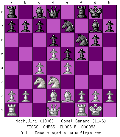 Last move : 0-1 2011 May 22 11:49:55 [Event "FICGS__CHESS__CLASS_F__000093"] [Site "FICGS"] [Date "2011.03.02"] [Round "1"] [White "Mach,Jiri"] [Black "Gonet,Gerard"] [Result "0-1"] [WhiteElo "1006"] [BlackElo "1146"] 1.c4 Nf6 2.Nc3 g6 3.Nf3 Bg7 4.d4 O-O 5.e4 d6 6.Be2 e5 7.O-O Nc6 8.d5 Ne7 9.Ne1 Nd7 10.Nd3 f5 11.Bd2 Nf6 0-1 English Opening Kingside Castling by player Black (move 4) Kingside Castling by player White (move 7) Player Black won this chess game. Follow this game move after move (download)There is only one thing Fischer does in Chess without pleasure: to lose ! (Boris Spassky) Bogoljubow: Matt in vier Zügen! Tartakower: Ich verbitte mir jede Belästigung! (Savielly Grigorievitsch Tartakower) En partidas rápidas, el Caballo es mas poderoso que el Alfil. (Vlastimil Hort) Votre seul travail dans les ouvertures est d'obtenir un milieu de partie jouable. (Lajos Portish) Macintosh - we might not get everything right, but at least we knew the century was going to end. (Douglas Adams)