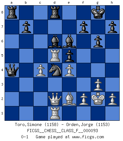 Last move : 0-1 2011 March 19 22:53:27 [Event "FICGS__CHESS__CLASS_F__000093"] [Site "FICGS"] [Date "2011.03.02"] [Round "1"] [White "Toro,Simone"] [Black "Orden,Jorge"] [Result "0-1"] [WhiteElo "1158"] [BlackElo "1153"] 1.e4 c5 2.Nf3 d6 3.c4 g6 4.d4 cxd4 5.Nxd4 Bg7 6.Be2 Qb6 7.Be3 Nc6 8.b3 Nxd4 9.Na3 Qb4+ 10.Qd2 Qxa3 11.Bxd4 e5 12.Bb2 Qc5 13.O-O Ne7 14.Rfe1 O-O 15.a4 a5 16.Ba3 Qb6 17.Rab1 Rd8 18.b4 axb4 19.Rxb4 Qa5 20.Rd1 Nc6 21.Rb5 Qxa4 22.Bxd6 Bf8 23.Rd5 Bxd6 24.g3 Nd4 25.Kg2 Be6 0-1 Sicilian Kingside Castling by player White (move 13) Kingside Castling by player Black (move 14) Player Black won this chess game. Follow this game move after move (download)Chess is a terrific way for kids to build self image and self esteem. (Saudin Robovic) Ohne Leiden bildet sich kein Charakter. (Ernst Freiherr von Feuchtersleben) Aquel que toma al Peón de Caballo de la Reina, se pasará la noche a dormir en la calle. (Anónimo) D'abord les bases : Jouez et étudiez, puis étudiez et jouez, ensuite jouez et étudiez, puis étudiez et jouez. Deuxièmement : Donnez toujours le meilleur de vous-même ! (Ken Smith) To err is human, but to really foul things up requires a computer. (Farmer's Almanac, 1978)