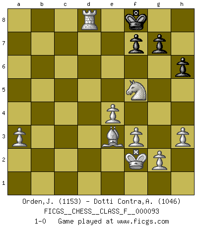 Last move : 1-0 2011 June 18 0:28:37 [Event "FICGS__CHESS__CLASS_F__000093"] [Site "FICGS"] [Date "2011.03.02"] [Round "1"] [White "Orden,Jorge"] [Black "Dotti Contra,Alessandro"] [Result "1-0"] [WhiteElo "1153"] [BlackElo "1046"] 1.e4 e5 2.Nf3 Nc6 3.Be2 Nf6 4.Nc3 d5 5.Nxd5 Nxd5 6.exd5 Qxd5 7.c4 Qd8 8.d3 Bd6 9.O-O O-O 10.Be3 b6 11.a3 Bg4 12.b4 h6 13.c5 bxc5 14.h3 Bh5 15.bxc5 e4 16.dxe4 Ne5 17.cxd6 Qxd6 18.Nxe5 Qxd1 19.Bxd1 Bxd1 20.Rfxd1 Rfe8 21.Nc6 a6 22.f3 Re6 23.Nd4 Rd6 24.Nf5 Rxd1+ 25.Rxd1 Kf8 26.Rd7 c6 27.Rc7 Rd8 28.Rxc6 a5 29.Ra6 Rd1+ 30.Kf2 Kg8 31.Rxa5 Kf8 32.Ra8+ Rd8 33.Rxd8+ 1-0 Inverted Hungarian Kingside Castling by player White (move 9) Kingside Castling by player Black (move 9) Player White won this chess game. Follow this game move after move (download)I believe that Chess possesses a magic that is also a help in advanced age. A rheumatic knee is forgotten during a game of Chess and other events can seem quite unimportant in comparison with a catastrophe on the chessboard. (Vlastimil Hort) Ivan Sokolov treibt mich als Beifahrer an mit go Loeky go - . (Loek van Wely) Un entendimiento a fondo de las continuaciones típicas del mate, hace de las combinaciones de sacrificio mas complicadas conducirlas a ellas no solo sin dificultad, sino casi de una manera natural. (Siegbert Tarrasch) Les Echecs sont et restent toujours un combat, un combat intégral comme la boxe, la lutte ou un autre sport, et où il doit y avoir un vainqueur et un vaincu. (Joseph Emil Diemer) History is the quarrels of popes and kings, with wars or pestilences in every page; the men all so good for nothing, and hardly any women at all. (Jane Austen)