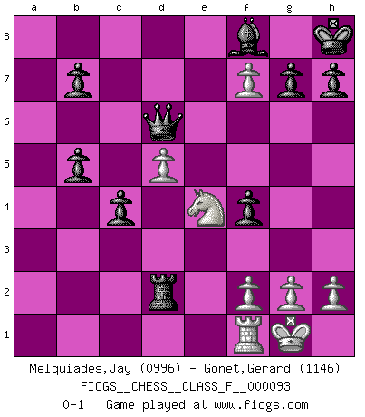 Last move : 0-1 2011 March 17 21:56:57 [Event "FICGS__CHESS__CLASS_F__000093"] [Site "FICGS"] [Date "2011.03.02"] [Round "1"] [White "Melquiades,Jay"] [Black "Gonet,Gerard"] [Result "0-1"] [WhiteElo "0996"] [BlackElo "1146"] 1.e4 Nc6 2.c3 e5 3.Nf3 d6 4.Bb5 Nge7 5.Qa4 Bd7 6.d4 a6 7.d5 axb5 8.Qb3 Na5 9.Qc2 Ng6 10.Nbd2 Be7 11.b4 Nf4 12.O-O Bg4 13.bxa5 c6 14.Nb3 c5 15.Bxf4 exf4 16.a4 c4 17.Nbd4 Rxa5 18.Rae1 Bxf3 19.Nxf3 Rxa4 20.Nd4 Qa5 21.e5 O-O 22.Nf5 Bd8 23.Nxd6 Ra2 24.Qf5 Qxc3 25.e6 Qf6 26.exf7+ Kh8 27.Qd7 Rd2 28.Re8 Be7 29.Rxf8+ Bxf8 30.Ne4 Qe5 31.Qd8 Qe7 32.Qd6 Qxd6 0-1 KP : Nimzovich defense Kingside Castling by player White (move 12) Kingside Castling by player Black (move 21) Player Black won this chess game. Follow this game move after move (download)Chess problems demand from the composer the same virtues that characterize all worthwhile art: originality, invention, conciseness, harmony, complexity, and splendid insincerity. (Vladimir Nabokov) Es gibt Leute, die glauben, alles wäre vernünftig, was man mit einem ernsthaften Gesicht tut. (Georg Christoph Lichtenberg) Coloca el contenido del tablero de Ajedrez en un sombrero, agita las piezas vigorosamente, derrámalas en el tablero desde una altura de medio metro y así obtienes el estilo de Wilhelm Steinitz. (H. E. Bird) Même un GMI sait rarement calculer sur plus de cinq coups une attaque à sacrifices. (Rudolf Spielmann) There is a great deal of difference between an eager man who wants to read a book and a tired man who wants a book to read. (G.K. Chesterton)