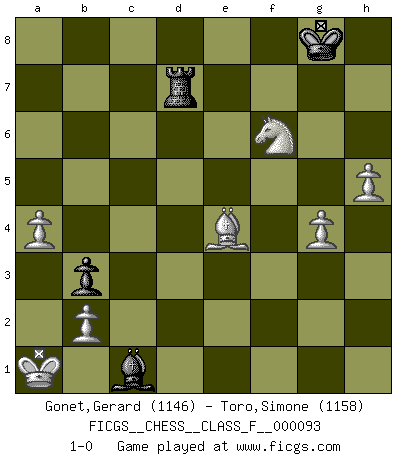Last move : 1-0 2011 March 13 20:14:10 [Event "FICGS__CHESS__CLASS_F__000093"] [Site "FICGS"] [Date "2011.03.02"] [Round "1"] [White "Gonet,Gerard"] [Black "Toro,Simone"] [Result "1-0"] [WhiteElo "1146"] [BlackElo "1158"] 1.d4 Nf6 2.f3 Nc6 3.Nc3 d5 4.e4 dxe4 5.Bf4 a6 6.Qd2 Nxd4 7.O-O-O Bf5 8.Bc4 e6 9.Qxd4 Be7 10.fxe4 Bg4 11.Qxd8+ Rxd8 12.Rxd8+ Bxd8 13.h3 Bh5 14.g4 Bg6 15.Nf3 Nxe4 16.Nxe4 Bxe4 17.Rf1 O-O 18.Ng5 h6 19.Nxe4 Kh8 20.Be5 b5 21.Bb3 f6 22.Bxe6 Re8 23.Bf5 Rxe5 24.Rd1 Re8 25.Nc5 c6 26.Nxa6 Bb6 27.Nb4 c5 28.Nd5 Ba7 29.Nc7 Rb8 30.Rd7 b4 31.Ne6 Bb6 32.Rxg7 c4 33.Rh7+ Kg8 34.Rxh6 Be3+ 35.Kb1 Bxh6 36.h4 Rb5 37.Nc7 Re5 38.a4 b3 39.cxb3 cxb3 40.Ka1 Bc1 41.h5 Re1 42.Bb1 Re7 43.Nd5 Rf7 44.Be4 Rd7 45.Nxf6+ 1-0 Paleface attack Queenside Castling by player White (move 7) Kingside Castling by player Black (move 17) Player White won this chess game. Follow this game move after move (download)Chess is so inspiring that I do not believe a good player is capable of having an evil thought during the game. (Wilhelm Steinitz) Matt entspricht nicht immer den Tatsachen. (Savielly Grigorievitsch Tartakower) El tablero es el mundo, las piezas es el fenomeno del universo, las reglas del juego son lo que llamamos leyes de la naturaleza y el jugador del lado opuesto, se encuentra oculto a nuestra vista. (Thomas Huxley) Un millionnaire : 'Monsieur Steinitz ! Vous ne participez aux tournois que pour l'argent, alors que moi je n'y viens que pour l'honneur.' Steinitz : 'Chacun joue pour ce qu'il n'a pas'... Beta. Software undergoes beta testing shortly before it's released. Beta is latin for still doesn't work. (Anonymous)