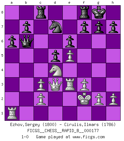 Last move : 1-0 2011 June 2 7:7:58 [Event "FICGS__CHESS__RAPID_B__000177"] [Site "FICGS"] [Date "2011.03.02"] [Round "1"] [White "Ezhov,Sergey"] [Black "Cirulis,Ilmars"] [Result "1-0"] [WhiteElo "1800"] [BlackElo "1786"] 1.e4 c6 2.d4 d5 3.e5 Bf5 4.Nf3 e6 5.Nc3 Bb4 6.Bd3 Ne7 7.O-O Nd7 8.Re1 Bxd3 9.Qxd3 c5 10.Bg5 cxd4 11.Nxd4 O-O 12.Bxe7 Qxe7 13.Rad1 Rac8 14.a3 Bxc3 15.bxc3 Qxa3 16.Ra1 Qc5 17.Re3 a6 18.f3 Qb6 19.Kf2 1-0 This chess game has been lost on time (started : 2011.03.02 13:35:51) Caro-Kann : Advance variation Kingside Castling by player White (move 7) Kingside Castling by player Black (move 11) Player White won this chess game. Follow this game move after move (download)Chess is ruthless: you've got to be prepared to kill people. (Nigel Short) Wenn du nicht weißt was du tun sollst, warte bis dein Gegner eine Idee hat. Sie wird sicher schlecht sein. (Siegbert Tarrasch) El Ajedrez es un invernadero donde los frutos del carácter pueden madurar mas completamente que en la vida. (Edward Morgan Foster) Les échecs sont un jeu terrible. Si vous n'avez pas le centre, votre adversaire a une position plus libre. Par contre, si vous avez le centre, alors vous avez vraiment quelque chose pour laquelle vous inquiéter ! (Siegbert Tarrasch) Yoga is 99% practice and 1% knowledge. (Sri Krishna Pattabhi Jois)