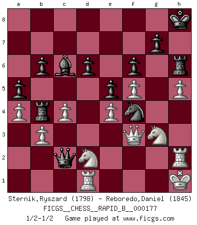 Last move : 1/2-1/2 2011 March 30 16:32:9 [Event "FICGS__CHESS__RAPID_B__000177"] [Site "FICGS"] [Date "2011.03.02"] [Round "1"] [White "Sternik,Ryszard"] [Black "Reboredo,Daniel"] [Result "1/2-1/2"] [WhiteElo "1798"] [BlackElo "1845"] 1.e4 c5 2.Nf3 e6 3.d4 cxd4 4.Nxd4 a6 5.Bd3 Bc5 6.Nb3 Ba7 7.Qe2 Nc6 8.Be3 d6 9.Bxa7 Rxa7 10.N1d2 Nf6 11.f4 O-O 12.Rd1 e5 13.f5 a5 14.a4 Nb4 15.Nc1 Bd7 16.b3 Qc7 17.c4 Qc5 18.g4 Bc6 19.Bb1 Qd4 20.g5 Nd7 21.Qf2 Nc5 22.Qf3 f6 23.Ne2 Qb2 24.g6 Nc2+ 25.Bxc2 Qxc2 26.gxh7+ Kxh7 27.Ng3 Nd3+ 28.Ke2 Nf4+ 29.Kf1 Rh8 30.h4 Kg8 31.Rh2 Ra6 32.Kg1 Rb6 33.h5 Rh6 34.Kh1 Rb4 35.Rf1 b6 36.Rd1 Kh8 37.Rg1 Kh7 38.Rd1 Kh8 1/2-1/2 Sicilian : Kan, Polugaievsky variation Kingside Castling by player Black (move 11) This chess game ended in a draw. Follow this game move after move (download)I played Chess with him and would have beaten him sometimes only he always took back his last move, and ran the game out differently. (Mark Twain) Wenn ich gewinne bin ich ein Genie. Wenn nicht, dann bin ich keines. (Robert James Fischer) Todo lo que importa ante el tablero de Ajedrez son buenas jugadas. (Bobby Fischer) Votre seul travail dans les ouvertures est d'obtenir un milieu de partie jouable. (Lajos Portish) Quotation,n.: The act of repeating erroneously the words of another. The words erroneously repeated. (Ambrose Bierce, The Devil's Dictionary)