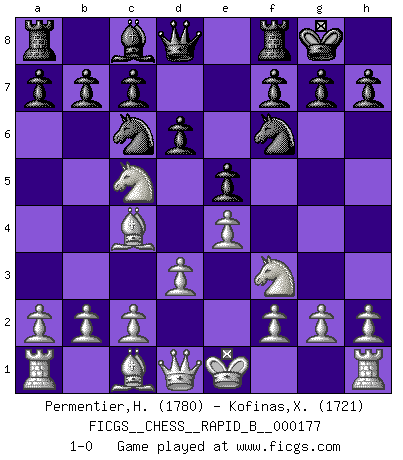 Last move : 1-0 2011 April 11 15:28:36 [Event "FICGS__CHESS__RAPID_B__000177"] [Site "FICGS"] [Date "2011.03.02"] [Round "1"] [White "Permentier,Herve"] [Black "Kofinas,Xristos"] [Result "1-0"] [WhiteElo "1780"] [BlackElo "1721"] 1.e4 e5 2.Bc4 Nf6 3.d3 Bc5 4.Nc3 d6 5.Nf3 Nc6 6.Na4 O-O 7.Nxc5 1-0 This chess game has been lost on time (started : 2011.03.02 13:35:51) Bishop's Opening : Berlin defense Kingside Castling by player Black (move 6) Player White won this chess game. Follow this game move after move (download)It is not enough to be a good player... you must also play well. (Siegbert Tarrasch) Sehr viele beherrschen heutzutage das große Einmalseins des Schachspiels und kennen sogar dessen Logarithmentafeln auswendig - deshalb sollte man hin und wieder zu beweisen trachten, dass zwei mal zwei auch fünf sein kann. (Mikhail Nekhemyevich Tal) El Ajedrez es tan inspirador que yo no creo que un buen jugador sea capaz de tener un pensamiento malo durante una partida. (Wilhelm Steinitz) Les échecs c'est le défi de l'alpiniste, toujours plus haut, prêt à tout pour monter à l'assaut du Roi ennemi. Les échecs, c'est de la musique en mouvement, un ballet majestueux pour les yeux. C'est de la poésie composée par les fantômes du passé qui au même titre que Rimbaud ou Verlaine méritent notre admiration. Les échecs, c'est de la peinture ou le moindre mouvement modifie le tableau pour en faire un Picasso ou un Van Gogh. Les échecs, c'est tout et rien, c'est la vie et la mort. Jjulie33 sur le forum de France-Echecs. Computers are like Old Testament gods; lots of rules and no mercy. (Joseph Campbell)