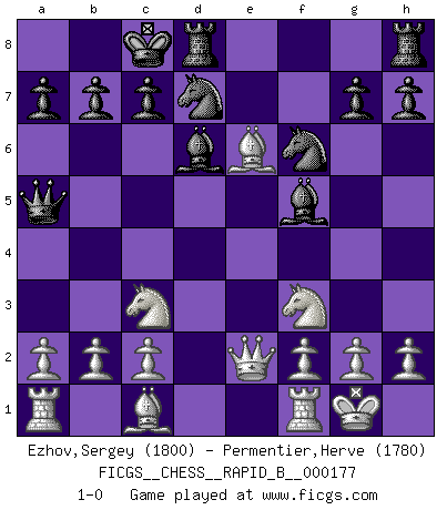 Last move : 1-0 2011 April 30 16:53:35 [Event "FICGS__CHESS__RAPID_B__000177"] [Site "FICGS"] [Date "2011.03.02"] [Round "1"] [White "Ezhov,Sergey"] [Black "Permentier,Herve"] [Result "1-0"] [WhiteElo "1800"] [BlackElo "1780"] 1.e4 d5 2.exd5 Qxd5 3.Nc3 Qa5 4.Nf3 Nf6 5.d4 Bf5 6.Bc4 e6 7.O-O Nbd7 8.Qe2 Bd6 9.d5 O-O-O 10.dxe6 fxe6 11.Bxe6 1-0 This chess game has been lost on time (started : 2011.03.02 13:35:51) Scandinavian (centre counter) defense Kingside Castling by player White (move 7) Queenside Castling by player Black (move 9) Player White won this chess game. Follow this game move after move (download)Some part of a mistake is always correct. (Savielly Tartakover) Die Fehler sind da, Sie warten nur darauf gemacht zu werden. (Savielly Grigorievitsch Tartakower) Es el objetivo de la escuela moderna no tratar cada posición de acuerdo a una regla general, sino de acuerdo al principio inherente en la posición. (Richard Reti) C'est la seule position que je connaisse où les deux camps sont mals. Propos prêtés à V. Anand. Pushing plastic is for the many, pushing virtual pieces is for the fewer, pushing wood is for the very few. (Normajean Yates)