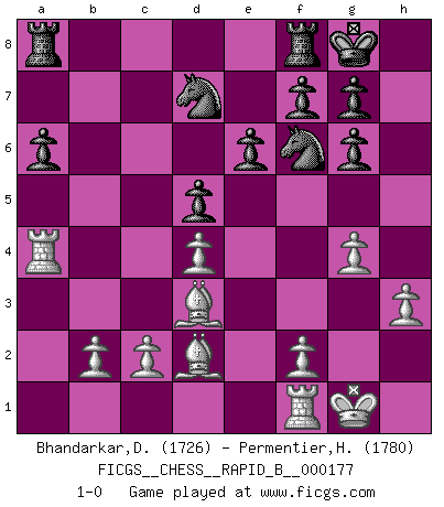 Last move : 1-0 2011 April 30 16:53:35 [Event "FICGS__CHESS__RAPID_B__000177"] [Site "FICGS"] [Date "2011.03.02"] [Round "1"] [White "Bhandarkar,Dinesh"] [Black "Permentier,Herve"] [Result "1-0"] [WhiteElo "1726"] [BlackElo "1780"] 1.e4 d5 2.exd5 Qxd5 3.Nc3 Qa5 4.Nf3 Nf6 5.Bc4 Bf5 6.O-O e6 7.d3 Nbd7 8.Bf4 Bd6 9.Qd2 O-O 10.Nb5 Qxd2 11.Bxd2 a6 12.Nxd6 cxd6 13.Nh4 Bg4 14.h3 Bh5 15.g4 Bg6 16.Nxg6 hxg6 17.d4 d5 18.Bd3 b5 19.a4 bxa4 20.Rxa4 1-0 This chess game has been lost on time (started : 2011.03.02 13:35:51) Scandinavian (centre counter) defense Kingside Castling by player White (move 6) Kingside Castling by player Black (move 9) Player White won this chess game. Follow this game move after move (download)There is no remorse like the remorse of Chess. (H. G. Wells) Das Schachspiel ist ein See, in welchem eine Mücke baden und ein Elefant ertrinken kann. (Emanuel Lasker) No hay otro maestro que tenga una voluntad terrífica de ganar. Al tablero, el irradía peligro y aún los oponentes mas fuertes tienden a congelarse como liebres cuando olfatean a una pantera. Aún sus debilidades son peligrosas. Con las blancas, su juego de apertura es predecible - te es posible hacer planes en su contra - pero es tan fuerte que tus planes casi nunca funcionan. En el juego medio, su precisión e invención son fabulosas y en finales, tú simplemente no le puedes vencer. (Experto Alemán anónimo) Les échecs sont un jeu par leur forme, un art par leur essence et une science par sa difficulté d'acquisition. Ils peuvent vous procurer autant de plaisir qu'un bon livre ou une belle musique, mais vous n'aurez une réelle joie que si vous arrivez à bien jouer. (Tigran Petrosian) Tomorrow's what you make of it. (Horatio Caine, C.S.I. Miami)