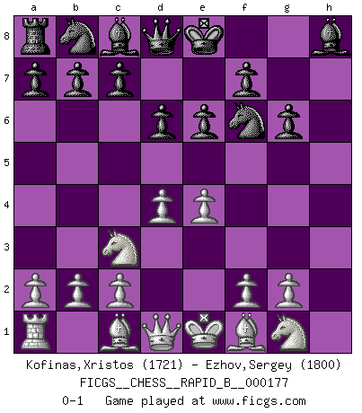 Last move : 0-1 2011 April 21 16:5:47 [Event "FICGS__CHESS__RAPID_B__000177"] [Site "FICGS"] [Date "2011.03.02"] [Round "1"] [White "Kofinas,Xristos"] [Black "Ezhov,Sergey"] [Result "0-1"] [WhiteElo "1721"] [BlackElo "1800"] 1.d4 d6 2.e4 g6 3.h4 Bg7 4.h5 Nf6 5.hxg6 hxg6 6.Rxh8+ Bxh8 7.Nc3 e6 0-1 This chess game has been lost on time (started : 2011.03.02 13:35:51) Queen's Pawn Player Black won this chess game. Follow this game move after move (download)My God, Bobby Fischer plays so simply. (Alexei Suetin) Ich verachte Kasparow. (Viktor Kortschnoi) Bobby es la celebridad menos entendida y malinterpretada que camina el la faz de esta tierra. (Yasser Seirawan) Ce qui caractérise les parties de combat, c'est que si le défenseur a constamment de difficiles problèmes à résoudre, l'attaquant doit chercher sans relâche de nouvelles possibilités d'attaque. (Koblentz) Once you start thinking you have nothing left to learn, you have everything to learn. (Steve Badget)