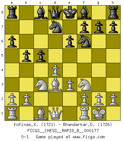 Last move : 0-1 2011 April 14 15:30:25 [Event "FICGS__CHESS__RAPID_B__000177"] [Site "FICGS"] [Date "2011.03.02"] [Round "1"] [White "Kofinas,Xristos"] [Black "Bhandarkar,Dinesh"] [Result "0-1"] [WhiteElo "1721"] [BlackElo "1726"] 1.d4 d5 2.c4 c6 3.Nc3 e6 4.Nf3 Nf6 5.e3 Nbd7 6.Bd3 dxc4 7.Bxc4 b5 8.Bd3 a6 9.O-O c5 0-1 This chess game has been lost on time (started : 2011.03.02 13:35:51) QGD Slav defense Kingside Castling by player White (move 9) Player Black won this chess game. Follow this game move after move (download)Only sissies Castle. (Rob Sillars) Im Fernschach kannst du während dem Spiel rauchen. (John Christen Knudsen) La partida mas dura de ganar es una partida ganada. (Emanuel Lasker) Il (Jacob Murray) ne joue pas pour le bon coup, mais pour le meilleur. (Eloi Relange) Two beer, or not two beer. (Unknown)