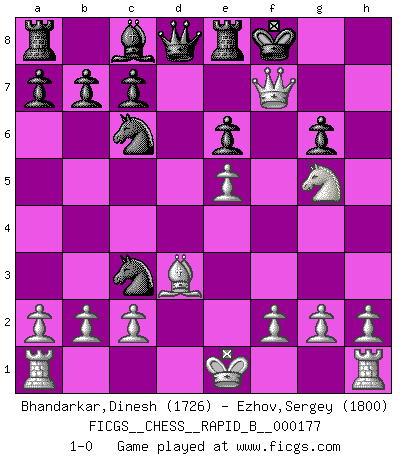 Last move : 1-0 2011 April 10 6:16:36 [Event "FICGS__CHESS__RAPID_B__000177"] [Site "FICGS"] [Date "2011.03.02"] [Round "1"] [White "Bhandarkar,Dinesh"] [Black "Ezhov,Sergey"] [Result "1-0"] [WhiteElo "1726"] [BlackElo "1800"] 1.e4 d6 2.d4 g6 3.Nc3 Bg7 4.Be3 Nf6 5.Bd3 O-O 6.Nf3 e6 7.Qd2 Re8 8.e5 dxe5 9.dxe5 Nd5 10.Bh6 Bxh6 11.Qxh6 Nxc3 12.Ng5 Nc6 13.Qxh7+ Kf8 14.Qxf7+ 1-0 King's pawn Opening Kingside Castling by player Black (move 5) Player White won this chess game. Follow this game move after move (download)No price is too great for the scalp of the enemy King. (Koblentz) Jeder weiß, dass Gasprom Putins persönliches Machtinstrument ist. Die Firma wird vom Kreml aus geleitet und wird schon deshalb nie transparent sein. (Garry Kasparov) El Ajedrez es un mar en el cual un mosquito puede beber y un elefante puede bañarse. (Refrán Hindú) Le jeu d'échecs fait naître et fortifie en nous plusieurs qualités précieuses dans le cours de l'existence, telles que la prévoyance, la circonspection, la prudence, et la persévérance. (Benjamin Franklin - 1783, la morale des échecs) The good fighters of old first put themselves beyond the possibility of defeat, and then waited for an opportunity of defeating the enemy. (Sun Tzu)