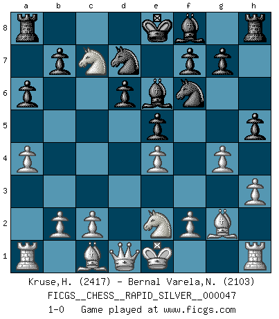 Last move : 1-0 2011 March 16 17:57:44 [Event "FICGS__CHESS__RAPID_SILVER__000047"] [Site "FICGS"] [Date "2011.03.02"] [Round "2"] [White "Kruse,Herbert"] [Black "Bernal Varela,Nelson"] [Result "1-0"] [WhiteElo "2417"] [BlackElo "2103"] 1.e4 c5 2.Nf3 d6 3.d4 cxd4 4.Nxd4 Nf6 5.Nc3 a6 6.h3 e5 7.Nde2 Be6 8.g4 h6 9.Bg2 Nbd7 10.a4 Qc7 11.Nd5 h5 12.Nxc7+ 1-0 Sicilian : Najdorf, Adams attack Player White won this chess game. Follow this game move after move (download)You cannot play at Chess if you are kind-hearted. (French Proverb) Computer sind die einzigen Gegner, die nicht immer eine Ausrede auf Lager haben, wenn sie gegen mich verlieren. (Robert James Fischer) Ciertamente el estado mental actual de Bobby Fischer es una tragedia. Uno de los mas grandes jugadores de Ajedrez del mundo -el orgullo y pena del Ajedrez Americano. (Frank Brady) Même si vous avez un bon coup à faire, regardez toujours s'il n'y en a pas un qui lui soit préférable. (Pedro Damiano) If only people were all showed a certain minimum level of niceness; if only people didn't retract verbal draw offers (without draw box ticked) on ficgs; if only people didn't kill; if only people didn't run concentration / extermination camps, if only people didn't drop nuclear bombs on Hiroshima and Nagasaki, and so on - it would be a much more beautiful world. But sadly, things are not so... (Normajean Yates)