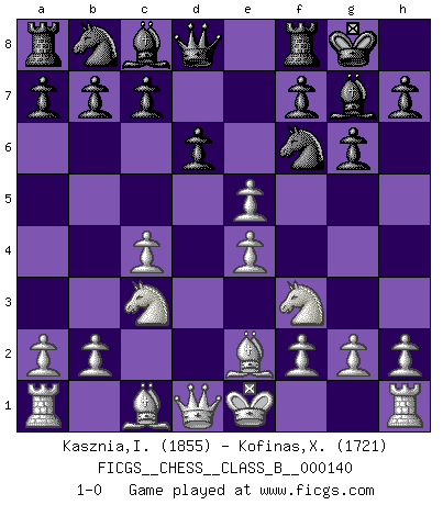 Last move : 1-0 2011 April 14 3:31:23 [Event "FICGS__CHESS__CLASS_B__000140"] [Site "FICGS"] [Date "2011.03.02"] [Round "1"] [White "Kasznia,Ireneusz"] [Black "Kofinas,Xristos"] [Result "1-0"] [WhiteElo "1855"] [BlackElo "1721"] 1.d4 Nf6 2.c4 g6 3.Nc3 Bg7 4.e4 d6 5.Nf3 O-O 6.Be2 e5 7.dxe5 1-0 This chess game has been lost on time (started : 2011.03.02 22:40:32) King's Indian : Andersson variation Kingside Castling by player Black (move 5) Player White won this chess game. Follow this game move after move (download)Chess is above all, a fight ! (Emanuel Lasker) Ein Gewinn durch eine ungenaue Kombination, sei sie auch noch so vorzeigbar, erfüllt mich mit Schaudern. (Wilhelm Steinitz) El jugador blanco perdió porque fallo en recordar la coreccta continuación y tuvo que pensar por sí mismo las movidas. (Siegbert Tarrasch) Ne tendez aucun piège pour le plaisir ! Ne jouez rien dans l'espoir que l'adversaire réagisse de façon stupide ! Prenez toujours pour acquis que l'adversaire va trouver le meilleur coup ! Ne jouez jamais de coup dans l'espoir que l'adversaire ne voie pas la menace ! Chacun de vos coups doit améliorer la position d'une façon ou d'une autre. The beginning is the most important part of the work. (Plato)