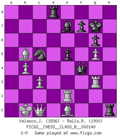 Last move : 1-0 2011 July 12 20:23:53 [Event "FICGS__CHESS__CLASS_B__000140"] [Site "FICGS"] [Date "2011.03.02"] [Round "1"] [White "Velasco,Jose Maria"] [Black "Ralls,Richard"] [Result "1-0"] [WhiteElo "1836"] [BlackElo "1900"] 1.e4 c5 2.Nf3 d6 3.d4 cxd4 4.Nxd4 Nf6 5.Nc3 a6 6.Be3 e6 7.f3 b5 8.Qd2 Nbd7 9.a3 Bb7 10.g4 h6 11.O-O-O Rc8 12.h4 d5 13.Rg1 dxe4 14.g5 hxg5 15.hxg5 Nd5 16.Nxe4 g6 17.Bf2 b4 18.axb4 Bxb4 19.c3 Be7 20.Kb1 e5 21.Nc2 Qc7 22.Bd3 Nf4 23.Nb4 Rd8 24.Nxa6 Qa5 25.b4 Qa3 26.Nc7+ Kf8 27.Qc2 Rh3 28.Rg3 Rh2 29.Bf1 Bc6 30.Rd2 Kg7 31.Qc1 Qa4 32.Ra2 Bxe4+ 33.fxe4 Qc6 34.Nd5 Nxd5 35.exd5 Qxd5 36.Rd2 Qe4+ 37.Bd3 Qf4 38.Be1 Rh1 39.Re2 Nc5 40.Bb5 1-0 Sicilian : Najdorf, Byrne (English) attack Queenside Castling by player White (move 11) Player White won this chess game. Follow this game move after move (download)Fischer sacrificed virtually everything most of us weakies (to use his term) value, respect, and cherish, for the sake of an artful, often beautiful board game, for the ambivalent privilege of being its greatest master. (Paul Kollar) Wie gewinnt Tal? Er entwickelt alle seine Figuren in die Brettmitte und opfert sie dann irgendwo. (Robert James Fischer) Siempre es mejor sacrificar los hombres de tu oponente. (Savielly Tartakower) Le jeu d'échecs fait naître et fortifie en nous plusieurs qualités précieuses dans le cours de l'existence, telles que la prévoyance, la circonspection, la prudence, et la persévérance. (Benjamin Franklin - 1783, la morale des échecs) The ultimate in disposing one's troops is to be without ascertainable shape. Then the most penetrating spies cannot pry in nor can the wise lay plans against you. (Sun Tzu)