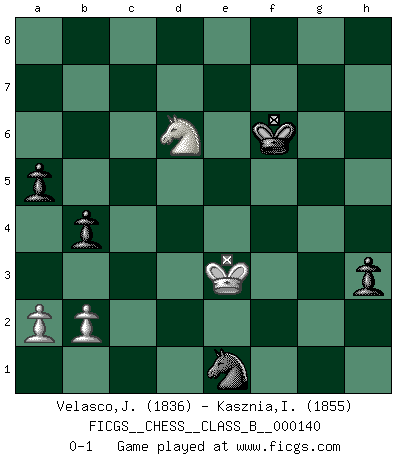 Last move : 0-1 2011 March 13 19:12:32 [Event "FICGS__CHESS__CLASS_B__000140"] [Site "FICGS"] [Date "2011.03.02"] [Round "1"] [White "Velasco,Jose Maria"] [Black "Kasznia,Ireneusz"] [Result "0-1"] [WhiteElo "1836"] [BlackElo "1855"] 1.d4 Nf6 2.c4 e6 3.Nf3 d5 4.Bg5 Be7 5.Nc3 O-O 6.e3 h6 7.Bh4 b6 8.Be2 Bb7 9.Bxf6 Bxf6 10.cxd5 exd5 11.Qb3 c6 12.O-O Na6 13.Qa3 Nc7 14.Ne5 Bxe5 15.dxe5 c5 16.f4 f6 17.exf6 Rxf6 18.Rae1 d4 19.Rd1 Qe8 20.exd4 cxd4 21.Bc4+ Kh8 22.Ne2 b5 23.Bd3 Nd5 24.Rde1 Qe3+ 25.Kh1 b4 26.Qb3 Re8 27.h3 a5 28.Kh2 Qe7 29.Bb5 Ne3 30.Rg1 Rg6 31.Bxe8 Rxg2+ 32.Rxg2 Nxg2 33.Qf7 Qxf7 34.Bxf7 d3 35.Ng3 Nxe1 36.Nf1 g5 37.Kg3 gxf4+ 38.Kxf4 Bg2 39.Nd2 Bxh3 40.Ke3 Kg7 41.Bd5 Kf6 42.Nc4 Ng2+ 43.Kd2 h5 44.Be4 h4 45.Kxd3 Bf5 46.Nd6 Bxe4+ 47.Kxe4 Ne1 48.Ke3 h3 0-1 Queen's pawn game Kingside Castling by player Black (move 5) Kingside Castling by player White (move 12) 10 pieces endgame at move 46 : White KNPP , Black KBNPPP WHITE : King + 1 Knight 2 Pawns BLACK : King + 1 Bishop 1 Knight 3 Pawns 9 pieces endgame at move 47 : White KNPP , Black KNPPP WHITE : King + 1 Knight 2 Pawns BLACK : King + 1 Knight 3 Pawns Player Black won this chess game. Follow this game move after move (download)Man is a frivolous, a specious creature, and like a Chess player, cares more for the process of attaining his goal than for the goal itself. (Dostoyevsky) Wenn Dein Gegner dir ein Remis anbietet, versuch herauszufinden, weshalb er glaubt schlechter zu stehen. (Nigel Short) El Ajedrez es tan inspirador que yo no creo que un buen jugador sea capaz de tener un pensamiento malo durante una partida. (Wilhelm Steinitz) Le joueur d'Echecs qui veut atteindre le top est obligé de développer son propre credo créatif. Alexeï Stepanovicth Souétine. Il est facile d'écrire des livres ! Ce qui est difficile, c'est de jouer ! (Alexeï Stepanovicth Souétine) The meaning of life is that it is to be lived, and it is not to be traded and conceptualized and squeezed into a pattern of systems. (Bruce Lee)