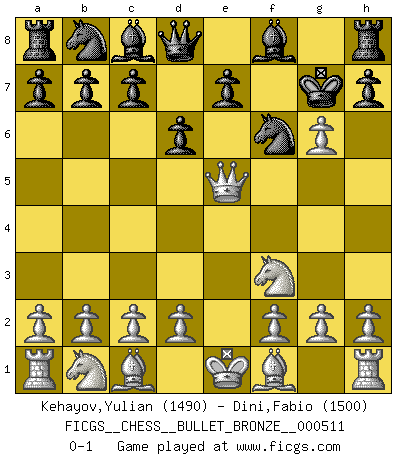 Last move : 0-1 2011 March 3 15:32:26 [Event "FICGS__CHESS__BULLET_BRONZE__000511"] [Site "FICGS"] [Date "2011.03.03"] [Round "1"] [White "Kehayov,Yulian"] [Black "Dini,Fabio"] [Result "0-1"] [WhiteElo "1490"] [BlackElo "1500"] 1.e4 f5 2.exf5 Kf7 3.Qh5+ g6 4.fxg6+ Kg7 5.Qe5+ Nf6 6.Nf3 d6 0-1 Fred Player Black won this chess game. Follow this game move after move (download)In the perfect Chess combination as in a first-rate short story, the whole plot and counter-plot should lead up to a striking finale, the interest not being allayed until the very last moment. (Yates and Winter) Es ist nicht das erste mal, dass sich die FIDE dem Arabischen Geld gebeugt hat (über die FIDE WM 2004 in Lybien). (Larry Evans) A través de las casillas del tablero, los Indios explican el movimiento del tiempo y la edad, las influencias mas altas que controlan el mundo y los lazos que vinculan al Ajedrez con el alma humana. (Al-Masudi) Les ravages du H expliquent la différence de niveau entre Tal et Thal [Abergel]. Art is the triumph over chaos. (John Cheever)