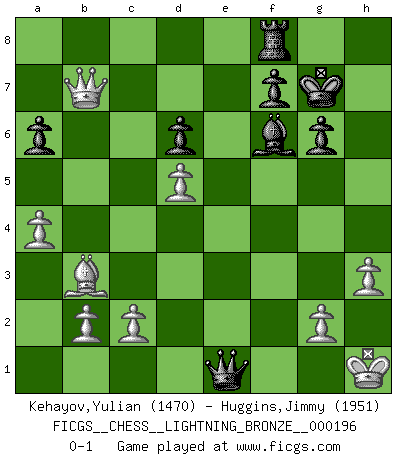 Last move : 0-1 2011 March 3 22:1:30 [Event "FICGS__CHESS__LIGHTNING_BRONZE__000196"] [Site "FICGS"] [Date "2011.03.03"] [Round "1"] [White "Kehayov,Yulian"] [Black "Huggins,Jimmy"] [Result "0-1"] [WhiteElo "1470"] [BlackElo "1951"] 1.e4 c5 2.Nf3 Nc6 3.Nc3 e5 4.Bc4 Be7 5.d3 Nf6 6.O-O d6 7.Bd2 O-O 8.a4 h6 9.Kh1 a6 10.h3 Be6 11.Nd5 Bxd5 12.exd5 Nb4 13.Bxb4 cxb4 14.Re1 Qc8 15.Qd2 Qc5 16.Bb3 Qa5 17.Qe2 Rae8 18.d4 exd4 19.Nxd4 Bd8 20.Qf3 Qc5 21.Nf5 g6 22.Nxh6+ Kg7 23.Ng4 Nxg4 24.Qxg4 Rxe1+ 25.Rxe1 Qxf2 26.Qxb4 Bf6 27.Qxb7 Qxe1+ 0-1 Sicilian defense Kingside Castling by player White (move 6) Kingside Castling by player Black (move 7) Player Black won this chess game. Follow this game move after move (download)Botvinnik tried to take the mystery out of Chess, always relating it to situations in ordinary life. He used to call Chess a typical inexact problem similar to those which people are always having to solve in everyday life. (Garry Kasparov) Die Neutralität betrachte ich als eine schwere Krankheit. (Viktor Kortschnoi) La única cosa que los jugadores de Ajedrez tienen en común, es el Ajedrez. (Lodewijk Prins) Avant la finale, les dieux ont créé le milieu de partie. (Tarrasch) You lose, general Kenobi. (General Grievous in Star Wars ep.3)