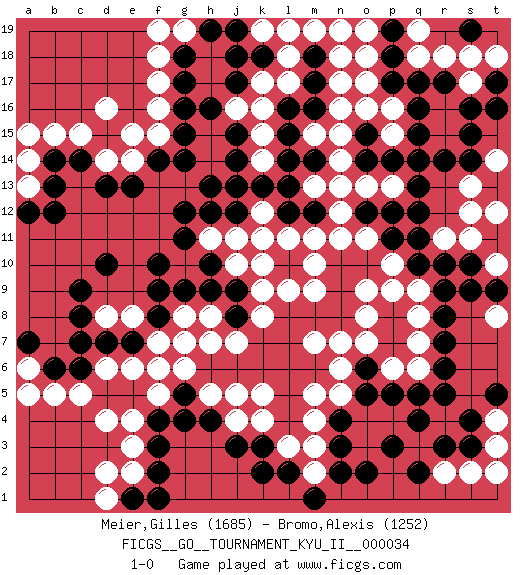 Last move : 1-0 2011 September 18 11:21:39 [Event "FICGS__GO__TOURNAMENT_KYU_II__000034"] [Site "FICGS"] [Date "2011.03.04"] [Round "1"] [Black "Meier,Gilles"] [White "Bromo,Alexis"] [Result "1-0"] [Rating 1 "1685"] [Rating 2 "1252"] 1.q16 d4 2.q4 d16 3.d10 k10 4.c6 c5 5.b6 b5 6.c14 c15 7.b14 b15 8.f3 e3 9.f4 e4 10.k3 k16 11.q10 o13 12.q13 p15 13.q15 p16 14.p17 o17 15.p18 o18 16.r5 q6 17.r6 q7 18.r7 q8 19.r8 q9 20.r9 p10 21.p11 o11 22.o10 p9 23.o12 n11 24.p12 n12 25.f14 e15 26.g15 f15 27.g16 f16 28.g17 f17 29.g18 f18 30.g14 e14 31.e13 d14 32.d13 d6 33.n9 m9 34.n8 n7 35.m8 m7 36.l8 l9 37.l7 l6 38.k6 k8 39.k7 j7 40.j6 h7 41.n10 m10 42.d7 e6 43.e7 f7 44.j8 k9 45.l12 l11 46.k13 m13 47.m12 m11 48.l13 k12 49.j12 k11 50.m14 n13 51.m16 m15 52.l15 n15 53.l16 n16 54.m17 n17 55.h9 h8 56.j9 j11 57.g9 g8 58.f8 g6 59.h6 g7 60.g5 f6 61.c7 f5 62.f2 e2 63.h12 h11 64.g11 j13 65.g12 k14 66.l14 k15 67.j14 g10 68.f10 l17 69.m18 l18 70.p14 n14 71.o15 o16 72.o14 p13 73.q14 m19 74.h13 n18 75.j13 l19 76.j17 k17 77.j18 h5 78.g4 a6 79.a7 a5 80.q11 o8 81.o6 o7 82.o5 k5 83.l5 j5 84.m6 o9 85.l6 n6 86.l4 n5 87.n4 o4 88.p5 p4 89.q5 m4 90.n3 m3 91.n2 o3 92.o2 l3 93.k2 k4 94.h4 e8 95.f9 d8 96.c8 m5 97.c9 a14 98.b13 a13 99.a12 a15 100.b12 g19 101.h19 f19 102.e1 d1 103.f1 d2 104.p19 o19 105.j15 s18 106.r17 s17 107.s16 r18 108.t17 t18 109.t16 q19 110.q17 j16 111.h16 j4 112.j3 r2 113.s3 s2 114.r3 q3 115.p3 p6 116.l2 m2 117.m1 s12 118.s10 s11 119.r14 s13 120.s14 t10 121.t9 t14 122.s15 r11 123.r10 k19 124.j19 n19 125.h10 j10 126.k18 t3 127.s4 t4 128.t5 t2 129.q2 q18 130.s19 t12 131.q12 t8 132.s9 1-0 Here are the names of the openings (joseki) played in the four corners : Corner d4 : d4 c6 Hoshi (Hwajeom, Seongjeom, Xingwei`) 4-4 Point. The star or hoshi (4-4) point, emphasizing influence at the potential expense of territory. Ikken Kakari (Hankan Keolch'im, Yi Gua`jiao~, 1-Space Low Approach). Black 2 is the standard approach move to the 4-4. Corner d16 : d16 c14 Hoshi (Hwajeom, Seongjeom, Xingwei`) 4-4 Point. The star or hoshi (4-4) point, emphasizing influence at the potential expense of territory. Ikken Kakari (Hankan Keolch'im, Yi Gua`jiao~, 1-Space Low Approach). Black 2 is the standard approach move to the 4-4. Corner q16 : q16 o13 Hoshi (Hwajeom, Seongjeom, Xingwei`) 4-4 Point. The star or hoshi (4-4) point, emphasizing influence at the potential expense of territory. Player Black won this Go (weiqi, baduk) game. Follow this game move after move (download)If you cannot succeed, then die gloriously. (Chinese proverb) He who is a good ruler must first have been ruled. (Aristotle)