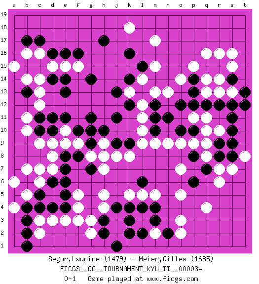 Last move : 0-1 2011 August 20 0:3:47 [Event "FICGS__GO__TOURNAMENT_KYU_II__000034"] [Site "FICGS"] [Date "2011.03.04"] [Round "1"] [Black "Segur,Laurine"] [White "Meier,Gilles"] [Result "0-1"] [Rating 1 "1479"] [Rating 2 "1685"] 1.d4 q16 2.d16 q4 3.h17 q10 4.c10 f3 5.h3 f5 6.m4 c6 7.b4 c3 8.c4 d3 9.e4 f4 10.d6 d7 11.e6 c9 12.e7 d8 13.e8 e9 14.b6 b7 15.c5 c7 16.b3 e3 17.b2 c2 18.g7 h5 19.k4 j3 20.j4 h4 21.k3 j2 22.h2 g3 23.k2 g2 24.j1 c14 25.d10 d9 26.f10 e10 27.e11 f9 28.g11 b10 29.c11 b11 30.b13 c12 31.d11 c13 32.e13 c16 33.c17 d15 34.e16 h9 35.g9 g8 36.g10 a6 37.a5 b5 38.e5 a4 39.b1 h7 40.f8 h8 41.j13 m17 42.b15 b16 43.c15 b14 44.d14 e15 45.f16 o3 46.e14 f15 47.b17 a15 48.g14 l9 49.k9 k8 50.j9 j8 51.h10 l10 52.j11 m2 53.l6 l5 54.l4 m5 55.l2 k5 56.n2 o2 57.m3 m13 58.l15 m15 59.k16 k18 60.l13 l12 61.k12 l14 62.k14 k13 63.q7 o7 64.r9 q9 65.r8 r6 66.p6 o5 67.s11 r10 68.s10 s7 69.s8 r7 70.s14 s16 71.r15 r16 72.p13 q8 73.o12 q14 74.q15 p15 75.p14 r13 76.r12 s13 77.t12 q13 78.q12 t8 79.s9 p11 80.t13 s15 81.s12 r14 82.p12 o14 83.n11 n9 84.m11 l11 85.m12 n13 86.m10 m9 87.o10 o9 88.p10 q11 89.p8 p9 0-1 Here are the names of the openings (joseki) played in the four corners : Corner d4 : d4 f3 Hoshi (Hwajeom, Seongjeom, Xingwei`) 4-4 Point. The star or hoshi (4-4) point, emphasizing influence at the potential expense of territory. Ikken Kakari (Hankan Keolch'im, Yi Gua`jiao~, 1-Space Low Approach). White 2 is the standard approach move to the 4-4. Corner q4 : q4 m4 Hoshi (Hwajeom, Seongjeom, Xingwei`) 4-4 Point. The star or hoshi (4-4) point, emphasizing influence at the potential expense of territory. Player White won this Go (weiqi, baduk) game. Follow this game move after move (download)Pon-nuki is worth thirty points. (Anonymous) Don't anthropomorphize computers - they hate it. (Anonymous)