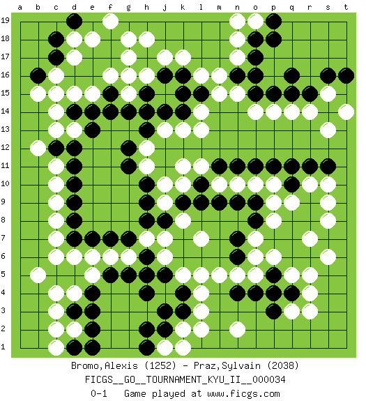 Last move : 0-1 2011 November 1 17:5:10 [Event "FICGS__GO__TOURNAMENT_KYU_II__000034"] [Site "FICGS"] [Date "2011.03.04"] [Round "1"] [Black "Bromo,Alexis"] [White "Praz,Sylvain"] [Result "0-1"] [Rating 1 "1252"] [Rating 2 "2038"] 1.q16 d4 2.d16 r4 3.q10 l3 4.k4 l4 5.d10 k17 6.k16 l16 7.l15 m16 8.n16 m15 9.k15 j17 10.j16 h16 11.h15 g15 12.h14 g16 13.g14 c14 14.d14 d13 15.e13 d15 16.e14 c13 17.d12 e15 18.f15 f16 19.f14 c16 20.e16 c15 21.h17 g18 22.f17 g17 23.f18 h18 24.c17 d17 25.e17 d18 26.c18 e18 27.q4 q3 28.p3 q5 29.p4 r3 30.d3 c3 31.e4 c4 32.d5 e5 33.e3 d6 34.c5 b5 35.f5 c6 36.k3 k5 37.j5 j6 38.h5 l5 39.h6 j7 40.j8 h7 41.g7 j4 42.j3 g6 43.g5 f6 44.f7 e6 45.e7 k8 46.h8 l7 47.n7 o6 48.n6 o5 49.o4 n5 50.n4 n2 51.p5 p6 52.q6 r5 53.r6 s6 54.q7 p8 55.p7 o7 56.o8 m5 57.q8 p9 58.o9 p10 59.p11 o10 60.n9 n10 61.m9 m10 62.l9 k11 63.l10 l11 64.m11 q9 65.r9 r10 66.q11 s9 67.r8 s8 68.r11 s10 69.s11 k10 70.k9 j9 71.h9 j10 72.h10 h11 73.g11 h12 74.g12 l13 75.h13 j13 76.j14 k13 77.k14 q14 78.r15 r14 79.s14 s13 80.q15 p14 81.p15 o14 82.o15 n17 83.o17 n18 84.o18 c8 85.d8 c9 86.d9 c11 87.d11 c10 88.c12 b12 89.d7 o19 90.p19 n19 91.p18 n15 92.o16 s15 93.s16 t14 94.t16 k2 95.j2 l2 96.h4 j1 97.h1 k1 98.h2 d2 99.e2 c2 100.d1 c1 101.e1 l14 102.o11 r7 103.n11 c7 104.d19 f19 105.b16 b15 0-1 Here are the names of the openings (joseki) played in the four corners : Corner q16 : q16 l16 Hoshi (Hwajeom, Seongjeom, Xingwei`) 4-4 Point. The star or hoshi (4-4) point, emphasizing influence at the potential expense of territory. Corner d16 : d16 j17 Hoshi (Hwajeom, Seongjeom, Xingwei`) 4-4 Point. The star or hoshi (4-4) point, emphasizing influence at the potential expense of territory. Corner d4 : d4 d3 Hoshi (Hwajeom, Seongjeom, Xingwei`) 4-4 Point. The star or hoshi (4-4) point, emphasizing influence at the potential expense of territory. Player White won this Go (weiqi, baduk) game. Follow this game move after move (download)If you lose by one point, take a rest. (Anonymous) There is far too much law for those who can afford it and far too little for those who cannot. (Derek Bok)